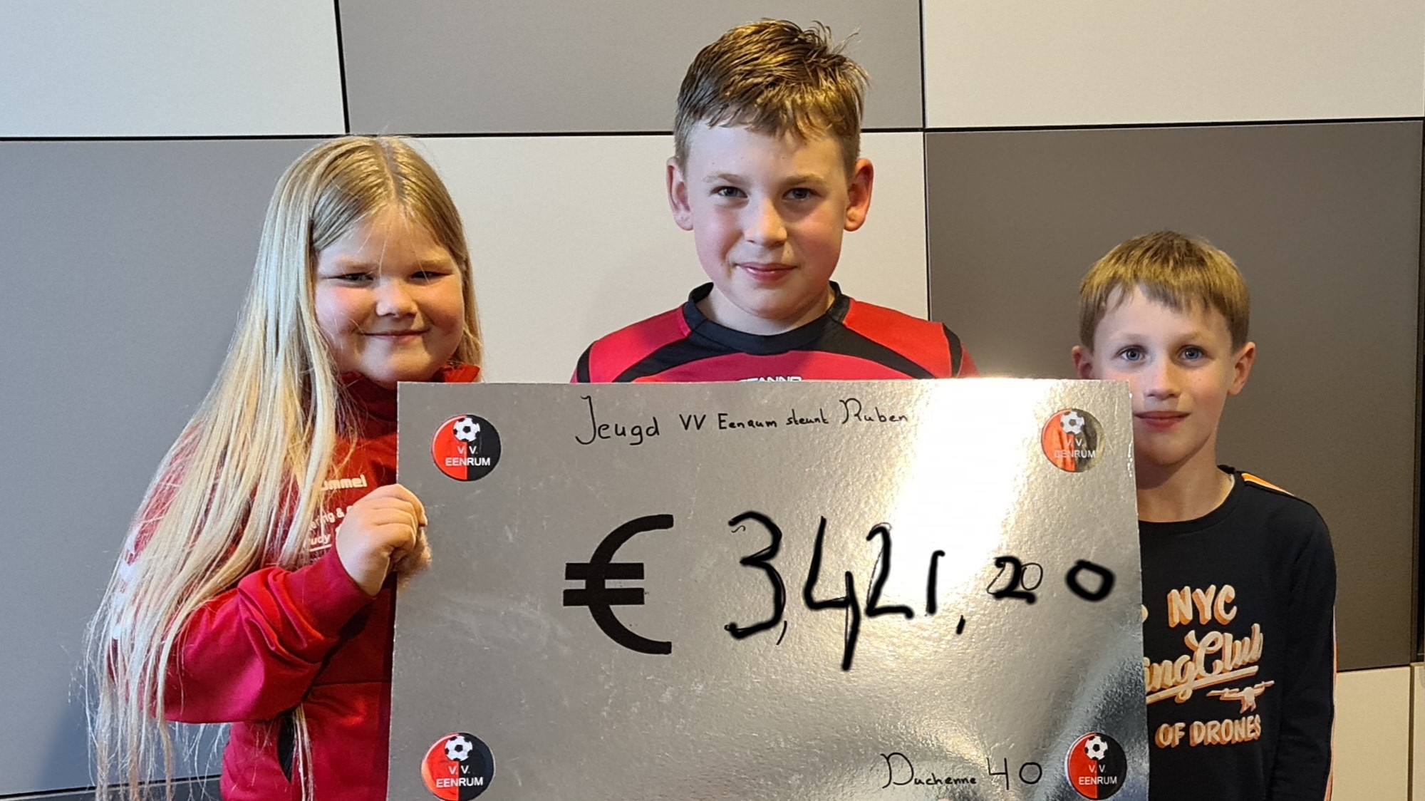 Jeugd VV Eenrum schiet ruim 3 mille bij elkaar voor Duchenne 28 mei 202128 mei 2021 Whatsapp Share Share EENRUM – Ondanks de corona pandemie en de al zeer lange voetbal loze periode is de jeugd van VV Eenrum de afgelopen maanden wekelijks in touw geweest. Iedere zaterdag werd er wel wat voor de jeugd georganiseerd. Dimietri Meijer voorzitter van de jeugdcommissie verteld trots dat ze zeker niet stil hebben gezeten. Het is gewoon belangrijk dat de jeugd lekker aan het voetballen blijft en niet alleen de training door de week maar ook in het weekend, vervolgt Meijer. Het zaterdag ritme hebben we er ‘gewoon’ ingehouden. Samen met Kor Nienhuis was hij de afgelopen maanden iedere zaterdag te vinden op het prachtige vernieuwde sportpark van VV Eenrum. Zo werd er onlangs ook een zeer sympathieke actie bedacht om de door Duchenne getroffen jonge dorpsgenoot Ruben Mulder te helpen. Voorzitter Jansen is trots op de jeugdspelers van de roodbaadjes, maar ontzettend trots op de jeugdcommissie en alle vrijwilligers die deze actie gelijk met beide handen aan pakten. “Het gaat eigenlijk binnen onze vereniging heel natuurlijk” laat Jansen weten. “Kor belde me dat hij een idee had nadat ie hoorde dat onze jonge dorpsgenoot Ruben (8 jaar) getroffen is door de spierziekte Duchenne. Wij waren als bestuur direct enthousiast en zo werden de schouders onder een inzamelingsactie gezet geheel in de voetbalsfeer.” Jeugdspelers zochten allemaal fanatiek sponsoren, die de spelers per gemaakte strafschop betaalden. “Iedere jeugdspeler mocht 5 strafschoppen nemen” vertelt Kor Nienhuis. Dimitrie Meijer vult grappend aan: “Uiteraard hebben we goed gezocht naar wat keepers die hun dag niet helemaal hadden.” Uiteraard was Corona ook wel enigszins een spelbreker voor deze actie, een sponsoractie als deze wil je natuurlijk op een goed gevuld sportpark spelen. Hoe meer publiek hoe beter, alleen ging dat nu helaas niet. En ondanks dat is er toch een geweldig bedrag van bijna 3500 euro opgehaald. VV Eenrum overhandigde afgelopen woensdag de cheque ter waarde van 3421 euro aan Paul Mulder, de vader van Ruben. Paul gaat samen met Ruben in juni een fietstocht van 40 kilometer fietsen. Zij doen mee aan de landelijke actie Duchenne 40 in Utrecht. Ruben is fanatiek aan het inzamelen en dit enorme bedrag komt daar nu bij glundert Paul. Ruben is al de koploper als het gaat om het sponsorbedrag van deze fietstocht, hij haalde al 5000 euro op, hier komt nu dus ook nog eens deze 3421 euro bij. Natuurlijk is er altijd nog meer nodig voor goed onderzoek naar deze vreselijke spierziekte. Wil jij net als de voetballertjes van de voetbalvereniging in Eenrum Ruben en z’n vader, en daarmee ook de landelijke actie, steunen, dan kun je doneren via deze link. Nieuws