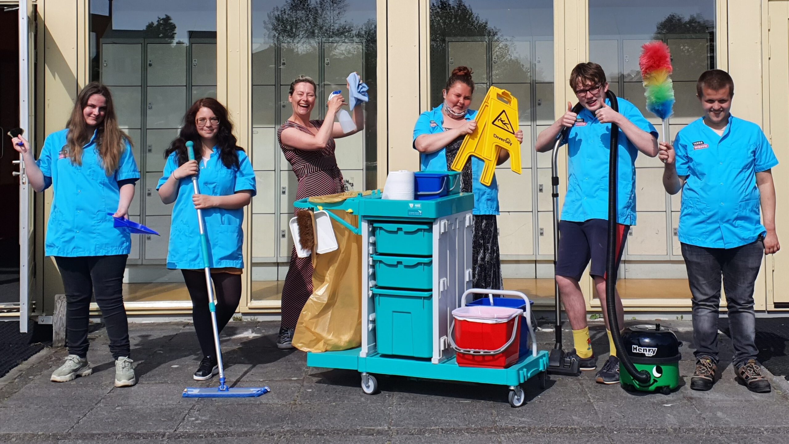 Blije gezichten op het Praktijkonderwijs van Terra Winsum 11 juni 2021 Whatsapp Share Share WINSUM – Vorige week donderdag zijn alle leerlingen uit klas 4/5 van het Praktijkonderwijs van Terra Winsum geslaagd voor hun examen ‘Werken in de schoonmaak- SVA1’. De leerlingen hebben dit schooljaar geoefend met schoonmaken van sanitair en interieur en met stofwissen en moppen. Dit alles volgens de milieuvriendelijke microvezelmethode waarbij zonder schoonmaakmiddel gewerkt wordt. Alle geslaagden hebben een prachtig certificaat meegekregen en kunnen dit weer toevoegen op hun CV! Op de foto 5 van de 6 geslaagde leerlingen met hun docent. V.l.n.r. Judith Knol (Harkstede), Gabriëlla Frank (Baflo), docent Nans Noorman, Mandy Roskam (Uithuizen), Wessel Rink (Groningen) en Wilbert Wildeboer (Appingedam). David Stam (Groningen) ontbreekt op de foto. Nieuws