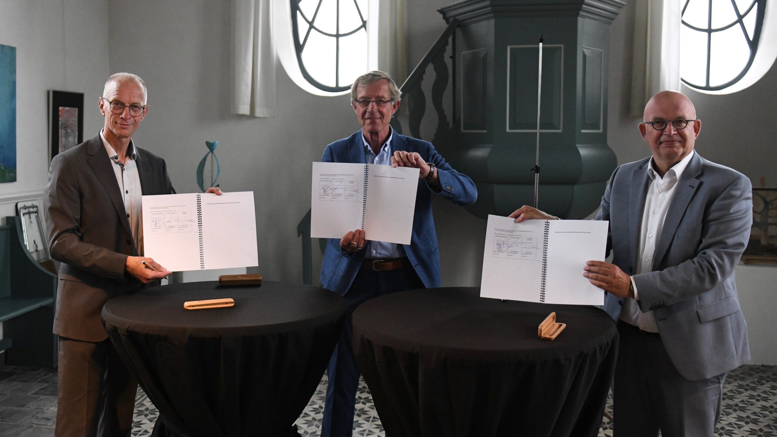 Drie overheden werken samen aan veilig en aantrekkelijk Zoutkamp 30 juni 2021 Whatsapp Share Share ZOUTKAMP – Dinsdag hebben de gemeente Het Hogeland, de provincie Groningen en het waterschap Noorderzijlvest een samenwerkingsovereenkomst getekend, die het realiseren van tien koppelkansen binnen het project Nieuwe Waterwerken Zoutkamp mogelijk maken. Met de samenwerking verbeteren de drie overheden de waterveiligheid, de toegankelijkheid en de toeristische en recreatieve infrastructuur in en rond Zoutkamp. In totaal zullen de drie gebiedspartners ruim 32 miljoen euro investeren in Zoutkamp. Wethouder Theo de Vries van Het Hogeland, gedeputeerde Henk Staghouwer van de provincie Groningen en loco-dijkgraaf Eisse Luitjens van het waterschap bekrachtigden de samenwerking tijdens een feestelijke ceremonie. De ondertekening van de samenwerkingsovereenkomst vond plaats in de Oude Kerk van Zoutkamp. Toekomstbestendig Zoutkamp De gebiedspartners kunnen nu van start met de voorbereidingen voor het realiseren van de koppelkansen. De voorbereiding moet in 2022 afgerond zijn, waarna de gebiedspartners kunnen starten met de realisatie. In 2025 moeten de plannen klaar zijn. “De samenwerkingsovereenkomst is een belangrijke, volgende stap die we samen zetten om Zoutkamp deze mooie impuls te kunnen geven”, zegt wethouder Theo de Vries, “We maken Zoutkamp op deze manier toekomstbestendig.” Waterwerken De waterwerken bestaan uit de bouw van een nieuw gemaal en het ombouwen van de Hunsingosluis tot een schutsluis. De investeringen in de waterwerken leveren kansen op om ook de toeristische en recreatieve infrastructuur een impuls te geven, de zogenaamde koppelkansen. Koppelkansen Deze koppelkansen bestaan onder meer uit de bouw van een nieuwe fiets- en voetgangersbrug over de Reitdiepsluis, de realisatie van aanmeervoorzieningen in het Reitdiep en het Hunsingokanaal, het weer zichtbaar maken van de cultuurhistorische dijkbekleding en de aanleg van een fietspad van Zoutkamp naar Electra. Dat de kansen kunnen worden verzilverd, is onder meer te danken aan een bijdrage van het Nationaal Programma Groningen. Rolverdeling Het waterschap Noorderzijlvest zal de waterwerken realiseren. Loco-dijkgraaf Eisse Luitjens: “Het waterschap heeft deze enorme, door klimaatverandering veroorzaakte waterveiligheidsopgave, niet als zelfstandige overheid opgepakt maar bewust samen met de Zoutkampers en gebiedspartners, gemeente Het Hogeland en de provincie Groningen.” De provincie Groningen en de gemeente Het Hogeland gaan de kansen voor Zoutkamp verzilveren. Gedeputeerde Henk Staghouwer: “Met een nieuwe fiets- en voetgangersbrug over het Reitdiep lossen we een belangrijk knelpunt op in de verkeersveiligheid voor de inwoners en bezoekers van Zoutkamp. Hiermee wordt het dorp als toeristische trekpleister nog toegankelijker. Dat geldt ook voor de toervaart. Het wachten tijdens het gebruik van het gemaal behoort straks tot de verleden tijd, via de nieuwe schutsluis kunnen boten Zoutkamp straks altijd bereiken.” Nieuws