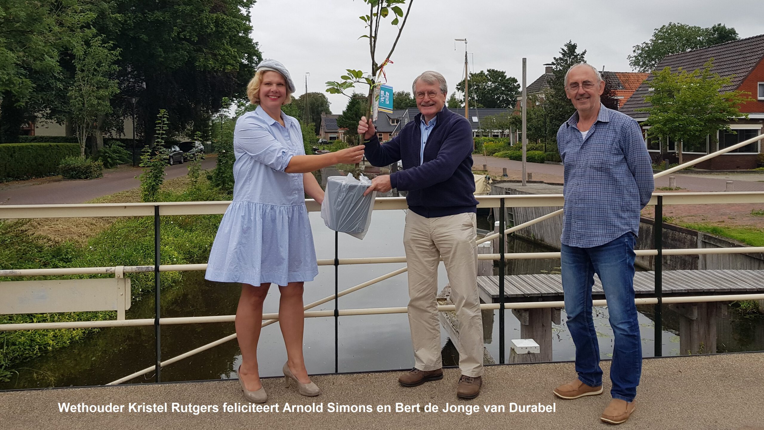 ZUIDWOLDE – Wethouder Kristel Rutgers feliciteerde woensdagmiddag energiecoöperatie Durabel uit Zuidwolde met de aanwijzing van Zuidwolde als proeftuin voor aardgasvrij wonen. Ze overhandigde een appelboompje aan Arnold Simons, voorzitter van Durabel. De plaatselijke energiecoöperatie nam het initiatief voor het plan.