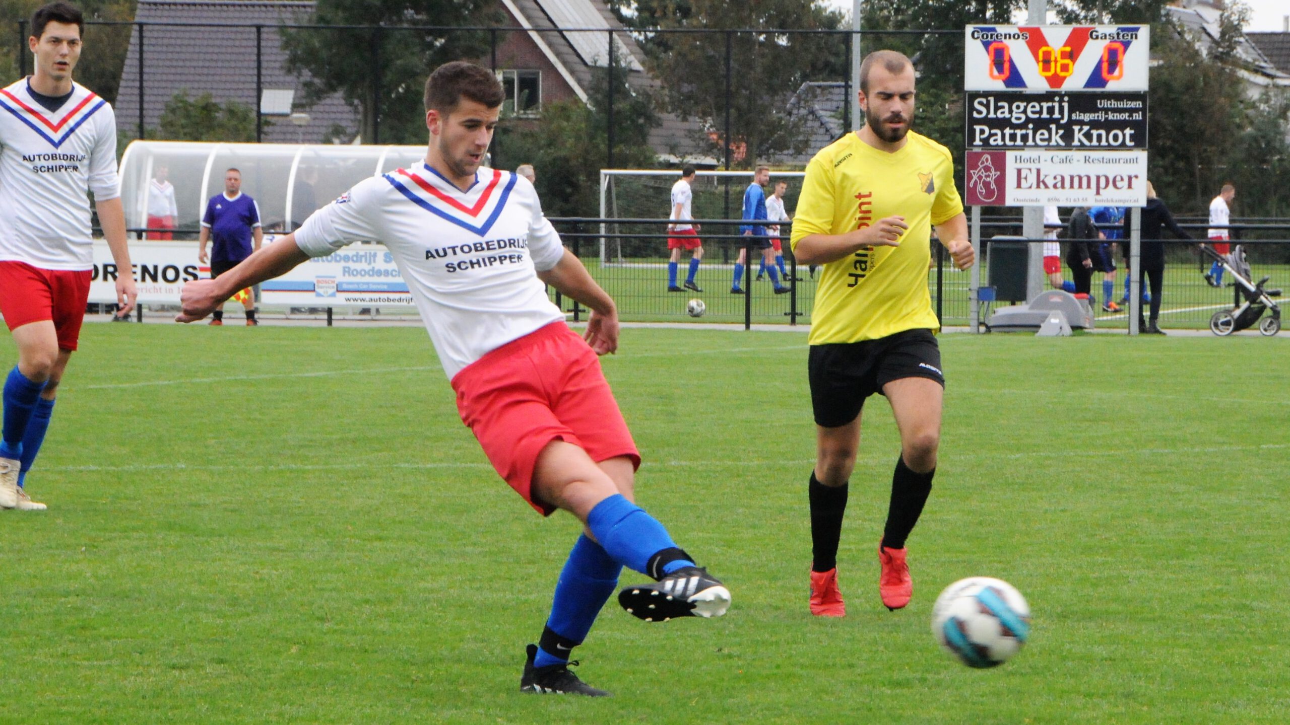 Corenos wint van strijdend, maar machteloos Warffum 3 oktober 20213 oktober 2021 Whatsapp Share Share ROODESCHOOL – Corenos-trainer Marco Pesiwarissa zag zijn team zaterdagmiddag winnen van Warffum. De 4-0 betekende de tweede zege van het nog prille seizoen, waarin het nu toch maar eens moet gaan gebeuren voor de Roodeschoolsters. De overwinning was volkomen terecht, maar in de afwerking schortte er nogal wat aan bij de thuisploeg. Warffum, dat aantrad met een gehavend elftal, maakte er met veel inzet – en de intentie om te voetballen – een wedstrijd van. Het bleef tot de 76ste minuut slechts 1-0, maar toen sloeg de thuisploeg binnen 3 minuten 3 keer toe en was de wedstrijd ‘over en uit’. De thuisploeg gingen voortvarend van start en nam in de 8e minuut al de leiding. Uit een hoekschop van Jordan Muller was het Wesley Dijksterhuis die zijn inzet via de onderkant van de lat tegen de touwen zag gaan. De supporters van Warffum vreesden het ergste. Immers, vorige week wonnen de Roodeschoolsters in Eenrum met een monsterscore, 3-10. Maar al snel was duidelijk dat Warffum zich niet zomaar naar de slachtbank zou laten leiden. Met veel inzet, korte dekking en scherpe duels werden de Roodeschoolsters bestreden. Warffum kwam daarbij via een snelle uitval tot een doelpoging; een schot van Roy Kuipers werd moeizaam verwerkt door Mark Monden, de doelman van Corenos. Na zo’n half uur spelen herpakte Corenos zich en wist het weer serieus gevaarlijk te worden. Eerst was het Lars Baar die alleen voor Warffum-goalie Eddy Renses verscheen, maar de niet te missen kans van de Roodeschoolster werd met door Renses met de voet gekeerd. Vier minuten later mocht de geheel vrijstaande Germen Tamsma een hoek uitkiezen toen hij een afgemeten voorzet van Joran Knot kon binnen koppen. Maar ook nu redde Renses met de voet. De kansen stapelden zich verder op; zo kopte Christian Uil uit een hoekschop van Jordan Muller van dichtbij naast, raakte Lars Baar op een paar meter voor het doel de bal helemaal verkeerd en dacht Muller even te makkelijk toen hij alleen op het doel af mocht gaan en door Jeroen Zwart werd achterhaald. Zo werd er met 1-0 gerust, een stand waarmee de gasten tevreden waren. In de tweede helft was het spelbeeld nagenoeg hetzelfde, Corenos op zoek naar de 2-0 en Warffum gedisciplineerd verdedigend loerend op in de omschakeling voetballend tot een uitval zien te komen op de momenten dat Corenos een steekje zou laten vallen. Toch wist de thuisploeg een paar keer door de Warffumer defensie te snijden en het doel van Eddy Renses onder vuur te nemen. Zo was het tien minuten na rust Joran Knot die in de korte hoek dacht te gaan scoren, maar doelman Renses wist de bal uit de benedenhoek te werken. Vijf minuten later kon Warffum zich onder de druk uit spelen en werd er een prachtige aanval opgezet, alleen werd de eindpass onderschept en volgde er een tegenaanval van Corenos. Lars Baar leek te gaan scoren, maar Eddy Renses en Jeroen Zwart wisten de Roodeschoolster aanvaller van scoren af te houden. Een minuut later was het wederom Lars Baar die de diepte in werd gestuurd. Renses doorzag het en was net eerder bij de bal om deze over de zijlijn te schoppen. Toch ieders verbazing kreeg de Warffumer doelman geel, hij zou een overtreding hebben gemaakt. Een belachelijke beslissing, ook volgens voetbalkenners uit Roodeschool. De toegekende vrije bal van Jordan Muller werd vervolgens door Renses bij de eerste paal gepareerd. De druk van Corenos hield aan en in de 70e minuut kreeg Joran Knot heel veel ruimte om alleen op het Warffumer doel af te gaan. Alleen voor Renses schoot de Knot voorlangs. Met nog een kwartier op de klok en de 1-0 stand op het scorebord moest Roy Kuipers – de motor en creativiteit van Warffum – geblesseerd het veld verlaten. Op dat moment leek het alsof erven iets knakte binnen Warffum. De organisatie was even weg, waarvan Corenos optimaal gebruik maakte. In de 76e minuut kwam Sven Knot vanaf de linkerkant naar binnen en kon ongehinderd uithalen. De bal verdween in de verre hoek, 2-0. Twee minuten later was het 4-0. In beide gevallen was Joran Knot de doelpuntenmaker. Warffum herpakte zich en vocht tot het laatste fluitsignaal voor wat het waard was. Corenos kreeg in de slotminuten nog twee goede mogelijkheden om het half dozijn vol te maken, maar die kansen waren niet aan Germen Tamsma en invaller Tim Uil besteed./AT Nieuws Sport