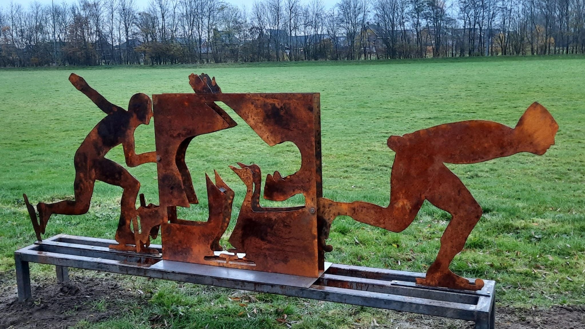 Onthulling schaatskunstwerk IJsvereniging Bedum 10 december 2021 Whatsapp Share Share BEDUM – Donderdag 9 december is op de ijsbaan in Bedum een schaatskunstwerk onthult. Het kunstwerk is ter ere van het 150-jarige jubileum van de ijsvereniging en staat voor de geschiedenis van de schaatssport . Kunstenaar Gerrit van Emous uit Putten maakte het kunstwerk van Cortenstaal. De onthulling is gedaan door ijsmeester Tonnie van der Werf en Sam Lijfering. Sam is de achterkleinzoon van Hilko Lijfering (sr.), die in het verleden lange tijd in het bestuur van de ijsbaan heeft gezeten. Ondanks Corona heeft de vereniging er een klein feestje van weten te maken (uiteraard binnen de huidige regels omtrent Corona). Naast de onthulling van het kunstwerk werd ook gelijk het water op de baan gelaten. Binnen een aantal dagen zal de baan geheel onder water staan en is het wachten op voldoende vorst, zodat leden het kunstwerk van dichtbij kunnen bewonderen. Nieuws