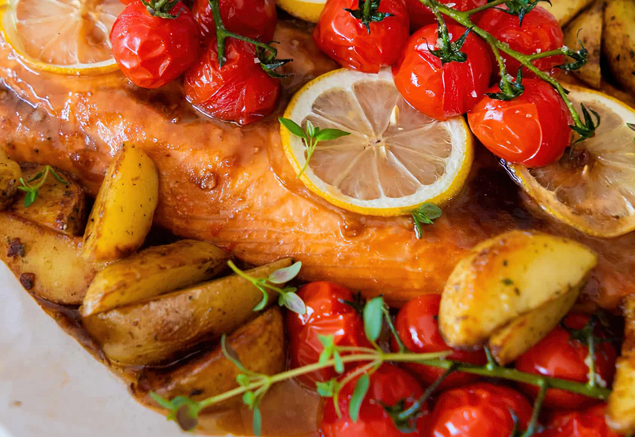 Ovenschotel met zalm. 24 februari 202223 februari 2022 Whatsapp Share Share Ingredieenten voor 4 personen: 2 eetlepels balsamicoazijn. 2 eetlepels olijfolie extra vergine. Zeezout. Zwarte peper 4 moten zalm van 150 gram. 4 plakjes citroen. Twee takken cherry tomaten. 800 gram aardappelpartjes voorgekookt. Bakolijfolie. 1 teentje knoflook, fijngehakt. Verse oregano, fijngehakt. Ook voor garnering. Bereiding: 15 minuten + Oven: 15 – 30 minuten Verwarm de oven voor op 200 graden. Bekleed een bakblik met bakpapier. Klop de balsamicoazijn en olijfolie extra vergine door elkaar in een kommetje. Breng dit goed op smaak met zout en peper. Leg de moot zalm op het bakpapier en dep droog met keukenpapier. Kwast de zalm vervolgens goed in met de balsamicodressing. Leg 4 partjes citroen bovenop de zalm. Meng de cherrytomaten voorzichtig met de resterende dressing en zet apart in een schaaltje. De aardappelpartjes meng je met een scheut bakolijfolie, knoflook, snuf zout en de fijngehakte kruiden. Leg die daarna om de zalm heen. Zet de bakplaat voor 15 – 30 minuten in de oven, de uiteindelijk tijd is afhankelijk van hoe dik je zalm is. Hoe dikker, hoe langer. Voor dunne filets is 15 minuten al voldoende om deze rosé te garen. Maar zorg er wel voor dat de aardappeltjes 30 minuten in de oven gaan en leg de laatste 10 minuten de gemarineerde cherrytomaten erbij. Serveer de zalm uit de oven met de aardappelpartjes en garneer met wat takjes oregano. Nog een bijgerecht? Serveer met een salade met geblancheerde groen asperges. Doe er een dressing bij van extra vergine olijfolie met citroensap en zout en peper. Eet smakelijk. Nieuws
