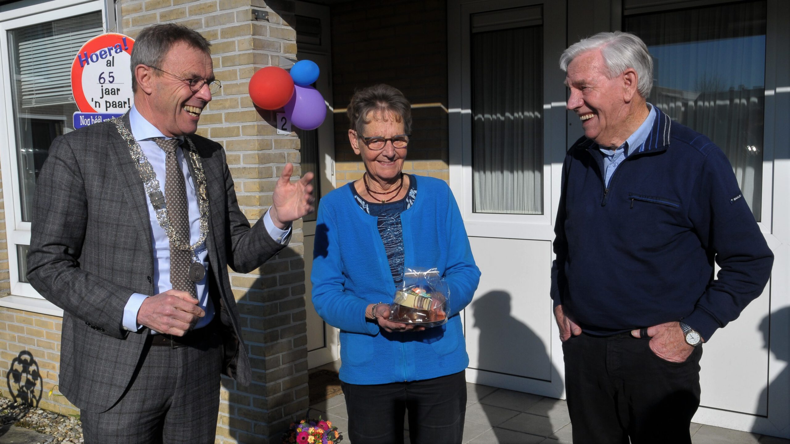65 jaar lief en leed in Bedum 9 maart 20229 maart 2022 Whatsapp Share Share BEDUM – Burgemeester Henk Jan Bolding bracht dinsdag 8 maart een bezoek aan het echtpaar Hamming-Eldering in Bedum. Het was precies 65 jaar nadat ze in het huwelijksbootje waren gestapt. Het ‘briljanten’ stel ontving naast de felicitaties een bos bloemen en de – inmiddels traditionele – chocolade van de gemeente. De heer Hamming werd geboren op 21 oktober 1934 in Oostwold (Westerkwartier). Zijn vrouw zag het levenslicht op 15 februari 1937 in Hoogkerk. Ze trouwden op 8 maart 1957 in Aduard. Het echtpaar had een veehouderij aan de Wolddijk bij Noordwolde. Het bedrijf wordt nu gerund door een kleinzoon. Hendrik Hamming verleent daar nog wel eens hand- en spandiensten. Ze verhuisden in 1985 naar Zuidwolde en een paar jaar later naar Noordwolde. Het echtpaar ging vervolgens in 1997 in Bedum wonen. Ze hebben drie zonen, acht kleinkinderen en zes achterkleinkinderen. Nieuws