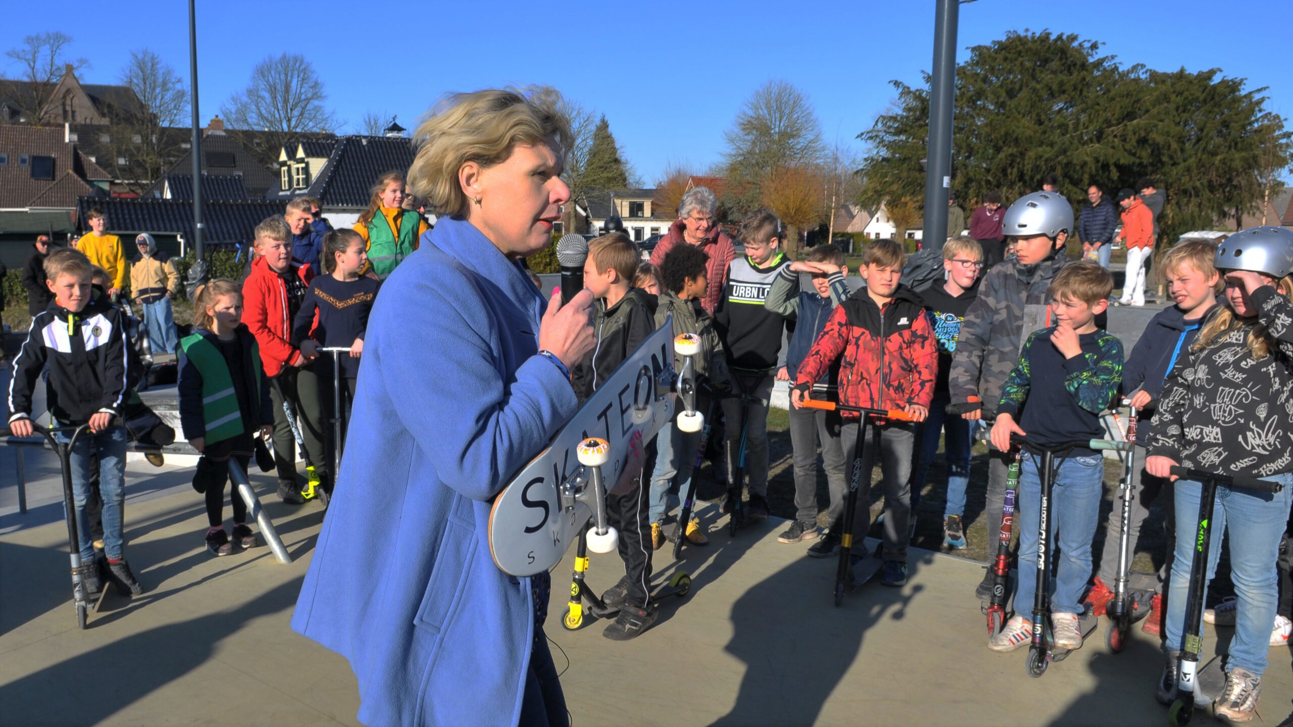 BEDUM – Dinsdagmiddag heeft wethouder Kristel Rutgers de skatebaan in haar woonplaats feestelijk geopend. Ze kreeg tijdens deze 2e officiele opening een skatebord overhandigd.