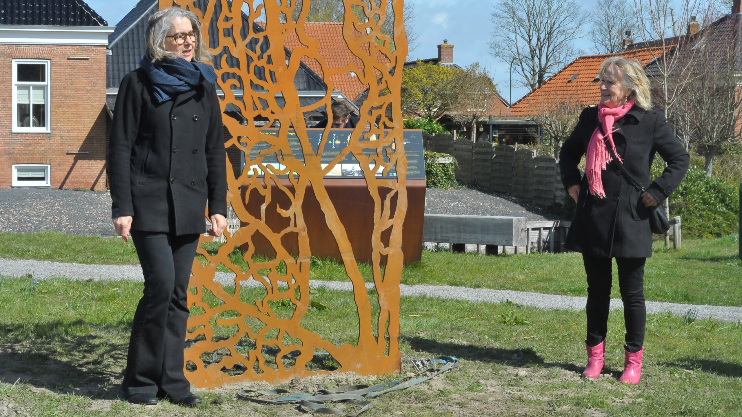 Kunstwerk Abel Stok onthuld 11 april 2022 Whatsapp Share Share MENSINGEWEER – Met de onthulling zondagmiddag van het kunstwerk Abel Stok werd de sage en het wilde bos bij Mensingeweer een plek in het dorp gegeven. Het bos Abelstok is een verwilderde fruitgaarde op zo’n kilometer ten westen van Mensingeweer. De bocht in de waterloop Kromme Raken draagt de naam Abelstok en de sage hierover vertelt dat een abt van het oude klooster van Kloosterburen er met een stok een doorwaarbare plaats zou hebben aangegeven. Dorpsbelangen Mensingeweer vroeg vorig jaar de inwoners naar wensen en ideeën voor de besteding van het dorpsbudget, een stimuleringsfonds van het gemeentebestuur. Gerda Bosscher (op de foto recht) kwam op het idee om er een kunstwerk voor te laten maken. Karin Hardonk (links) uit Rottum kreeg de opdracht ervoor. Het vier duizend euro kosten kunstwerk bestaat uit een vlak van cortenstaal. Daarin is het silhouet van een monnik met stok uitgesneden op een achtergrond van bladnerven. De nerven, de resten van bladeren verwijzen naar het bos. Cortenstaal is een legering, bestaande uit ijzer waaraan koper, fosfor, silicium, nikkel en chroom zijn toegevoegd. Het is een weervast staal en de bruine roestkleur is het meest typische uiterlijke kenmerk. Klier hier voor het verhaal ‘De hippies en hillbillies van Abelstok’ van Sanne Meijer. Nieuws