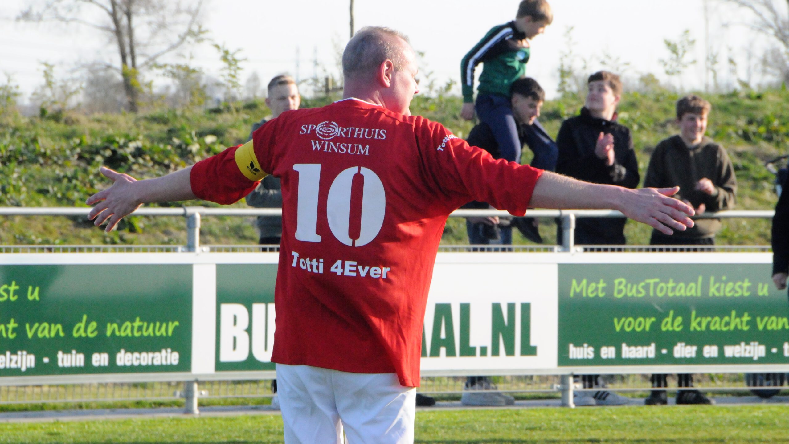 Doelpunt ‘Totti’ in wedstrijd van een lach en een traan 18 april 202218 april 2022 Whatsapp Share Share WINSUM – Op het Geert Reinders Sportpark werd zaterdag aan het eind van de middag een speciale wedstrijd gespeeld: de derby tussen Hunsingo en Viboa, de derby die sinds de fusie van beide clubs in 2016 niet meer was gespeeld. Het was de wens van de ongeneeslijk zieke Marten ‘Totti’ Dohmeijer, kind van Hunsingo, die in zijn afscheidswedstrijd stiekem ook nog z’n goaltje meepikte. In februari kreeg de 41-jarige Winsumer te horen dat kanker door z’n hele lichaam zit en dat er niets meer aan was te doen. Twee weken geleden kwam Marten met de wens om nog één keer de derby Hunsingo – Viboa te spelen. Reden voor z’n teamgenoten om dit snel te regelen nu Marten nog ‘wedstrijdfit’ is. Zaterdag was het dan ook al zover en het werd een dag om nooit te vergeten. Totti werd met de bus – dat ooit de spelersbus van PSV was – van huis gehaald en zag, net als de vele belangstellenden, 3 parachutisten vanuit de lucht neerdalen op het hoofdveld van vv Winsum. een met een vlag (Totti 4Ever), een met een KWF-beer en ook de wedstrijdbal kwam van boven. De opkomst van ‘Totti’ en z’n familie was indrukwekkend, door een haag van geel en rood en rook naar de middenstip, waar Dimitri Sennema de aanwezigen toesprak en zich richtte tot Marten, zijn vrouw Marloes en dochtertje Saar (9). Mooie woorden, Dohmeijer ontvangt van vv Winsum een cheque (€ 500,-) en er volgt nog een t.w.v. € 2500,- voor de spaarreking van Totti’s dochtertje. Het geld was bijeengebracht door de voetballers deze middag. Dohmeijer hield het bij weinig woorden, hij wilde snel nog een keer ‘lekker ouderwets ballen’. Lees verder onder foto’s De wedstrijd is aan de gang en de opmerkingen vanaf de kant richting de spelers in het veld laten niet lang op zich wachten. Keihard, niemand wordt gespaard. Ook niet als Totti in het veld staat. Het gaat niet allemaal even soepeltjes meer en ook hij krijgt ‘galgenhumor’ naar z’n hoofd geslingerd. Hij geniet ervan, een brede grijns is op grote afstand zichtbaar. Het hoort erbij. Het is de humor van z’n team dat nooit anders is geweest. Ook nu dus niet. Maar ver in de tweede helft snoert Totti alle critici de mond. Totti presteert iets wat Johan Cruyff niet lukte: scoren in z’n afscheidswedstrijd. Alleen jammer dat ploeggenoot Jack Magnin even daarvoor onbeholpen en hard in eigen doel had geschoten, anders had Totti’s goal ook nog een puntje opgeleverd. Na het laatste fluitsignaal volgde vuurwerk langs het veld en stond Dohmeijer de pers te woord. Dan eindelijk kon hij onder de douche en naar de kantine, waar vv Winsum voor een chinees buffet had gezorgd en de bierkranen open werden gezet. Ook werd het eindbedrag van de inzameling voor KWF kankerbestrijding die deze dag was opgehaald bekendgemaakt: € 5624,85. Dohmeijer hield het rond half 10 voor gezien en nam de taxi naar huis. Hij had een fantastische dag gehad, zijn wens was vele malen overtroffen./AT Nieuws