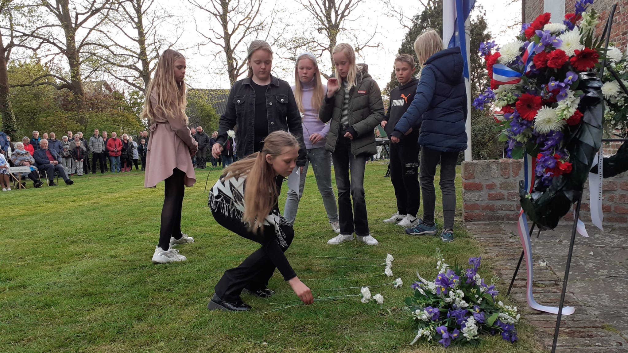Druk bezochte Dodenherdenking in Baflo 5 mei 2022 Whatsapp Share Share BAFLO – Onder zonnige weersomstandigheden vond woensdagavond in Baflo de traditionele Dodenherdenking plaats. In 2020 en 2021 was er vanwege de toen geldende corona-maatregelen sprake van een sobere editie zonder publiek. Nu deze maatregelen voorbij zijn, kende de herdenking weer een openbaar toegankelijk karakter. Om 19.50 uur vertrok de stoet met genodigden, voorafgegaan door de christelijke muziekvereniging ‘Excelsior’, vanaf dorpshuis Agricola naar het herdenkingsmonument aan de zuidzijde van de Laurentiuskerk. Daar legden raadslid Jacob Cleveringa van de gemeente Het Hogeland, Nico Werkman (voorzitter Algemene Oranjevereniging Baflo) en Ulfert Molenhuis uit Groningen (namens de schuilplaatsverleners) om twee minuten voor acht uur kransen. Naar schatting waren er bij de plechtigheid 250 tot 300 personen aanwezig, waaronder ook veel jongeren en kinderen. Na twee minuten stilte om klokslag acht uur speelde ‘Excelsior’ twee coupletten van het Wilhelmus, waarbij de meeste aanwezigen meezongen. Aansluitend hield Cleveringa namens de gemeente Het Hogeland een herdenkingsrede, waarbij hij ook stil stond bij de oorlog in Oekraïne. Verder lazen enkele leerlingen van SWS Noorderlicht gedichten voor en legden vertegenwoordigers van de Historische Kring Baflo en kinderen van de plaatselijke basisschool bloemen bij het monument. Ook hield Piet Gootjes – een achterneef van de in de oorlogsjaren omgekomen gebroeders Gootjes – een toepspraak. De herdenkingsplechtigheid, die half uur duurde, werd muzikaal omlijst door twee jonge leden van het Backer Trio uit Eenrum. Aan het slot van de ingetogen bijeenkomst legden bestuursleden van de Algemene Oranjevereniging Baflo en de genodigden bloemen bij het monument. Nadien bestond voor een ieder de mogelijkheid zelf meegebrachte bloemen aan de voet van het monument neer te leggen. Foto’s: Arie Molenhuis Nieuws