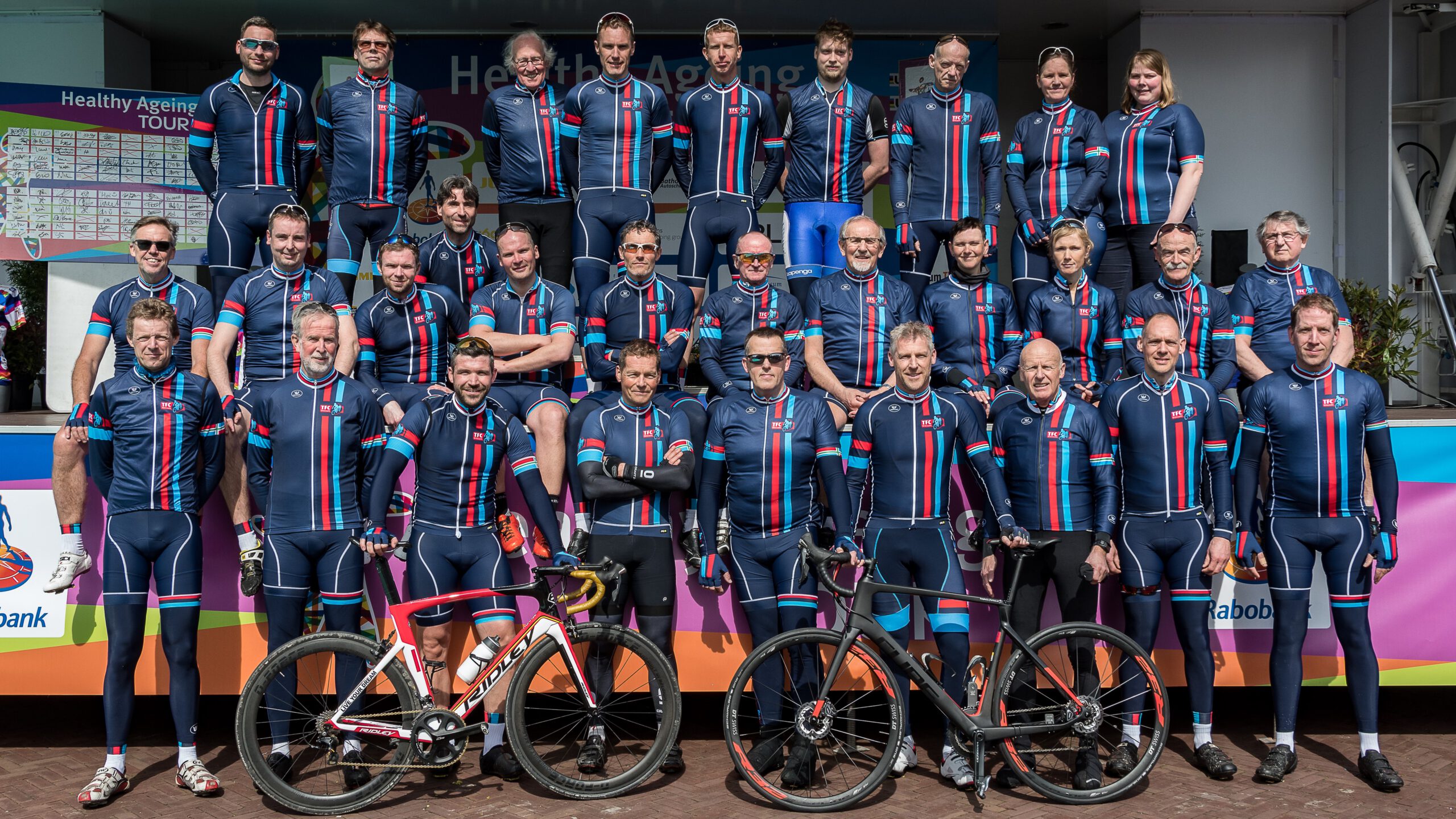 TFC Winsum viert haar 40-jarig jubileum 24 mei 2022 Whatsapp Share Share WINSUM – Afgelopen zaterdag heeft de Toer- en Fietsclub Winsum haar 40-jarig jubileum gevierd. Vanwege corona moest het feest helaas 2 keer uitgesteld worden, maar kon nu een jaar later toch eindelijk doorgang vinden. Het jubileum werd ’s middags feestelijk geopend met een toertocht van 80 kilometer door het mooie Groningerland. Na afloop kon men in het ijsbaangebouw deelnemen aan de BBQ onder muzikale begeleiding van DJ Juan. De grote opkomst en gezelligheid tot in de late uren bevestigden dat het de TFC Winsum als fietsclub voor de wind gaat. Oprichting De TFC Winsum werd op 6 juli 1981 opgericht onder de vlag van de Nederlandse Rijwiel Tour Unie. De nieuwbakken vereniging stelde zich ten doel, zoals de statuten mooi verwoorden: “het beoefenen van de wielersport in de ruimste zin des woords.” De roep om wielrennen in clubverband werd eind jaren ’70 steeds luider. Dat beeld werd bevestigd nadat er massaal gehoor werd gegeven aan een oproep in de Winsumer Wiekslag begin ’81. Ruim 25 fietsfanaten melden zich op 6 juli van dat jaar in het plaatselijke Café-Restaurant ‘De Gouden Karper.’ Na enige toelichting werd er een bestuur verkozen en was de Toer- en Fiets Club Winsum een feit. TFC-ers tijdens de Toeriade halverwege de jaren ’80 Clubkleding en sponsoring Om clubgevoel en de saamhorigheid te benadrukken werd gekozen om in clubkleding te rijden. Voor de aanschaf en sponsoring werd Tweewielerhuis Gerrit Poort bereid gevonden. De keuze viel op een oranje fietsshirt met groen-wit-groene band onderaan en de opdruk ‘TFC Winsum’ op de borst. Dit alles gecompleteerd met een zwarte koersbroek. Na enkele jaren werd garnalenverwerker Heiploeg hoofdsponsor en reden ruim 120 fietsers in het beroemde Heiploeg ‘garnalenshirt.’ Uitgevoerd in wit, blauw en rood. Daarna volgden meerdere hoofdsponsors waaronder Bikecenter Dik uit Groningen en verzekeraar Univé. Sinds 2018 is er gekozen om van kledingsponsoring af te zien en rijdt men in het huidige donkerblauwe clubtenue met witte en rode accenten. Op de mouw prijkt trots de Groninger vlag. Winsumer Wierdentocht Na een succesvolle start van de fietsclub ontstond halverwege de jaren ’80 het idee om als club een toertocht te organiseren. Het moest een jaarlijks terugkerend evenement worden, waarbij het mooie Groninger wierdenland centraal zou staan. Ideeën en plannen werden uitgewerkt tot een draaiboek. Na goedkeuring zag de, inmiddels vermaarde Winsumer Wierdentocht in 1986 het levenslicht. De toertocht groeide uit tot een klassieker, die jaarlijks op deelname van vele honderden fietsfanaten mag rekenen. Het kwalitatief hoogwaardig evenement is afgelopen april reeds voor de 34e keer georganiseerd. Dit alles door een onvermoeibare groep vrijwilligers. De WWT is hiermee niet meer weg te denken van de toerkalender van de Nederlandse Toer- en Fiets Unie (NTFU). En daar is de Winsumer fietsclub met recht trots op!. Heden en toekomst Al met al kan geconcludeerd worden dat de Winsumer wielervereniging na ruim 40 jaar nog steeds springlevend is en een mooie toekomst tegemoet gaat. Dit wordt bevestigd door het gestaag groeiende ledenaantal en de goedbezochte trainingsavonden, ‘social rides’ en gezamenlijke deelnames aan voorjaarsklassiekers, cyclo’s en monumenten. De TFC Winsum is een hechte fietsclub geworden waar gezelligheid en sportieve uitdagingen al ruim 40 jaar goed samengaan! Nieuws Sport