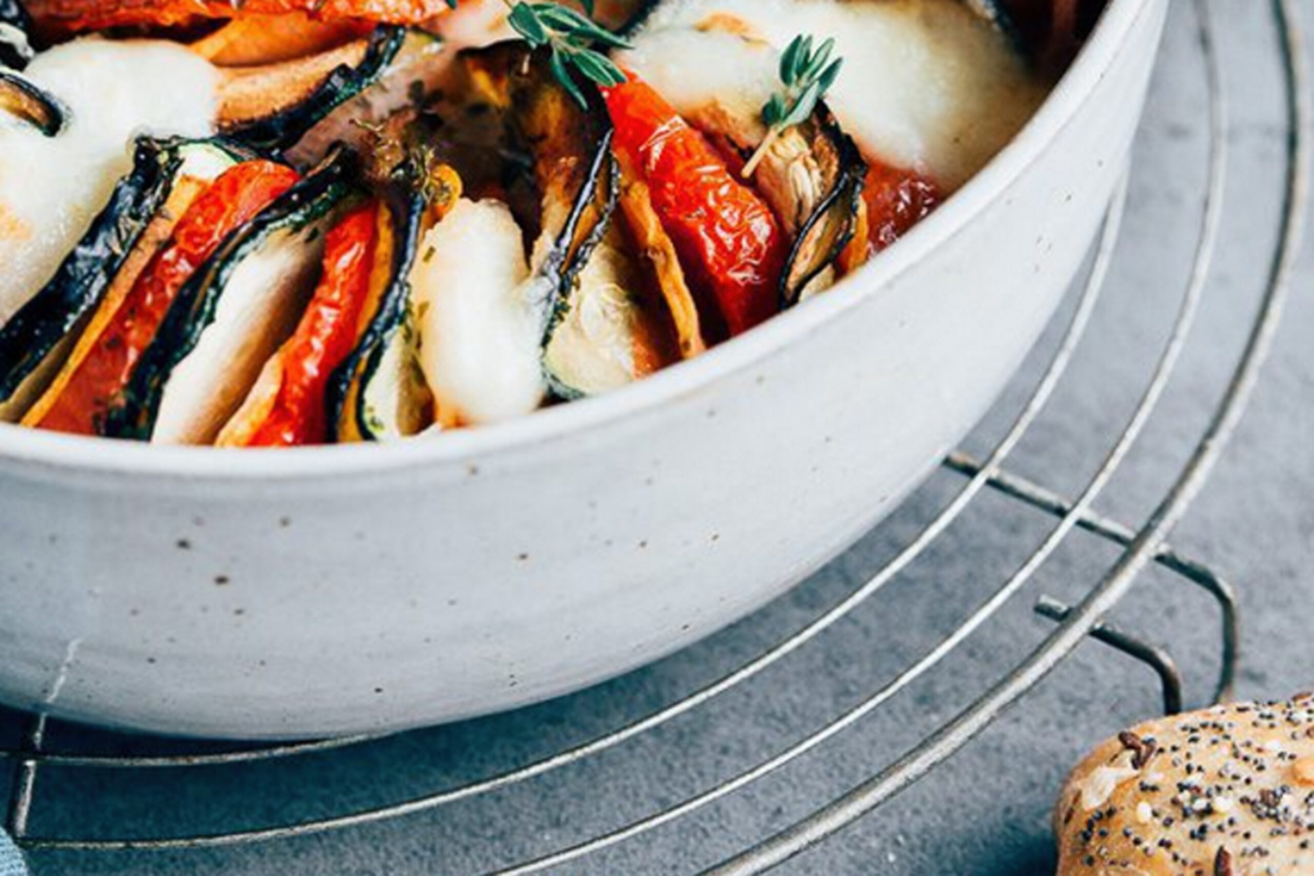 Vegetarische groentenschotel met zoete aardappel en mozzarella. 30 juni 202230 juni 2022 Whatsapp Share Share Ingrediënten voor 4 personen 400 gr tomatenblokjes (uit blik) 4 tomaten 1 courgette 1 aubergine 1 rode paprika 1 grote zoete aardappel 2 teentjes knoflook 1 bol mozzarella 3 tl Provençaalse kruiden Olijfolie Peper en zout Bereiding: Doe de tomatenblokjes in een ovenschaal . Breng de tomatenblokjes op smaak met peper, zout, 1 tl Provençaalse kruiden en een gehakt teentje knoflook. Meng even door elkaar. Was de groente en schil de zoete aardappel. Snijd de tomaat, courgette en aubergine in plakjes. Snijd de zoete aardappel in hele dunne plakjes. Liefst maximaal een mm dik want anders worden ze niet zo snel gaar. Snijd de paprika in repen. Verdeel de groentes om en om over de tomatenblokjes. Maak een kruidenolie van een flinke scheut olijfolie met 1 gehakt teentje knoflook, 2 tl Provençaalse kruiden en wat peper en zout. Bestrijk de groentes met de kruidenolie. Zet de oven aan op 170 graden en plaats de ratatouille schotel voor 25 minuten in de oven. Verdeel na 25 minuten de mozzarella over de schotel en zet hem nogmaals terug voor 10 minuten. Serveer de ratatouille schotel met brood. Eet smakelijk. Nieuws