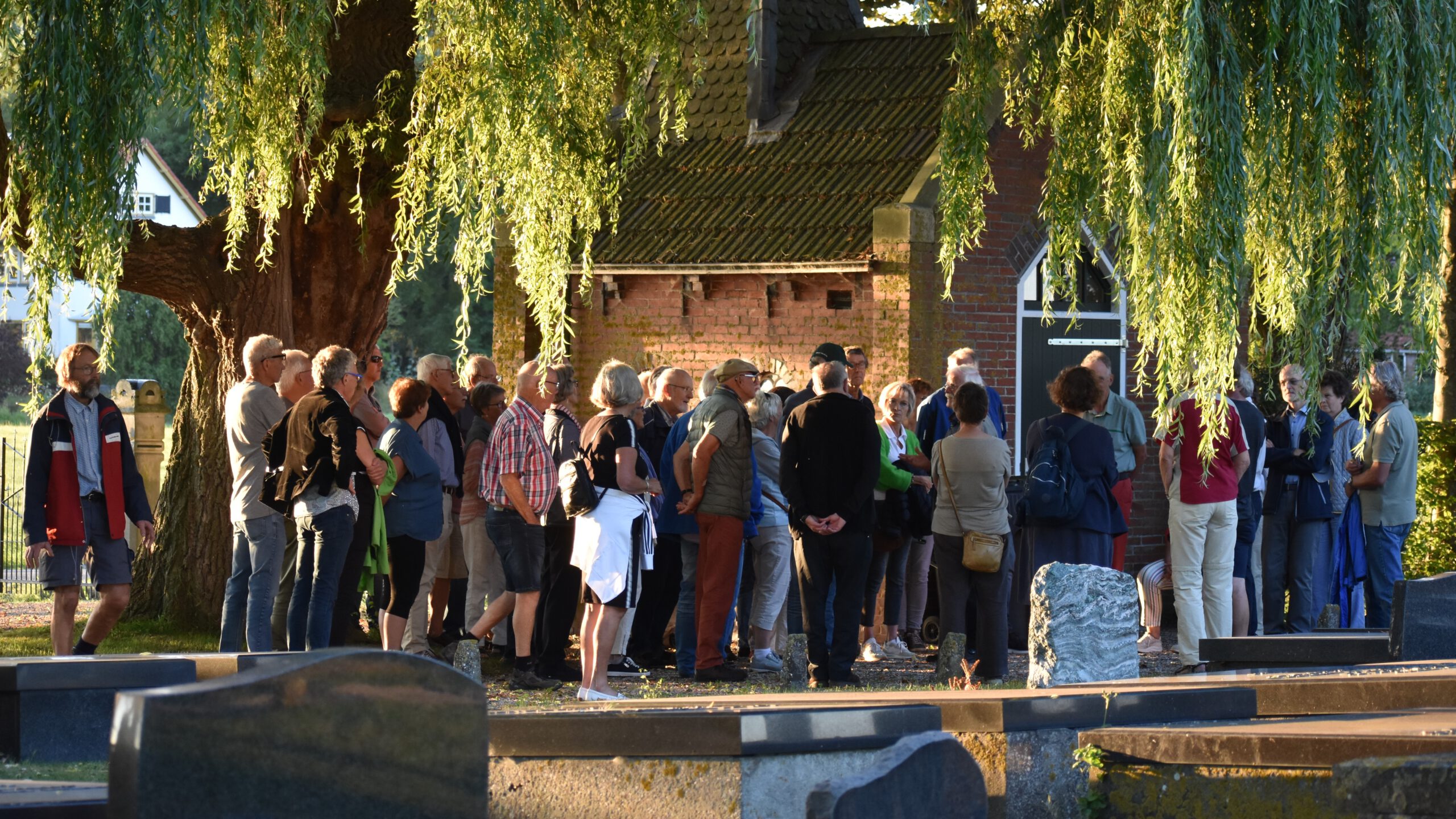 Zomeravondexcursie Wierde & Dijk groot succes 19 augustus 2022 Whatsapp Share Share HUIZINGE – Wierde & Dijk, vereniging voor agrarisch natuur en landschapsbeheer in Noord Groningen kijkt terug op een zeer geslaagde zomeravondexcursie. Deze excursie werd donderdag georganiseerd in het wierdedorp Huizinge onder leiding van dorpsbewoner en kenner van de Groninger geschiedenis Reint Wobbes. Ruim 70 mensen namen deel aan de excursie. Startpunt voor de excursie betrof de Janskerk, een romangotische kerk uit de 13e eeuw. Via een wandeling over een oude historisch kerkenpad is onder meer een bezoek gebracht aan de boerderij van de familie Westing waar op het land bloemzaden worden gekweekt voor de Cruydt-Hoeck, een bedrijf uit Nijeberkoop (Friesland) dat gespecialiseerd is in de teelt van wilde plantenzaden en bloemweidemengsels. Daarnaast is een bezoek gebracht aan de dorpsbegraafplaats uit 1916 die vanwege cultuurhistorische waarde is aangewezen als Rijksmonument. De avond is afgesloten bij de plaats Melkema, een monumentale boerderij welke recentelijk door het Groninger Landschap is gerestaureerd. Huizinge is een klein wierdedorp in de Groningse gemeente Eemsdelta met circa 100 inwoners. Het dorp bezit diverse historische gebouwen en meerdere oude kerkenpaden. Huizinge verkreeg landelijk haar bekendheid vanwege de aardgaswinning. Op 16 augustus 2012 om 22.31 werd dit dorp getroffen door een zware aardbeving met een kracht van 3,6 op de Schaal van Richter. Foto: Excursie begraafplaats Huizinge, op achtergrond lijkenhuis van architect Jacob Tilbuscher uit Middelstum Nieuws