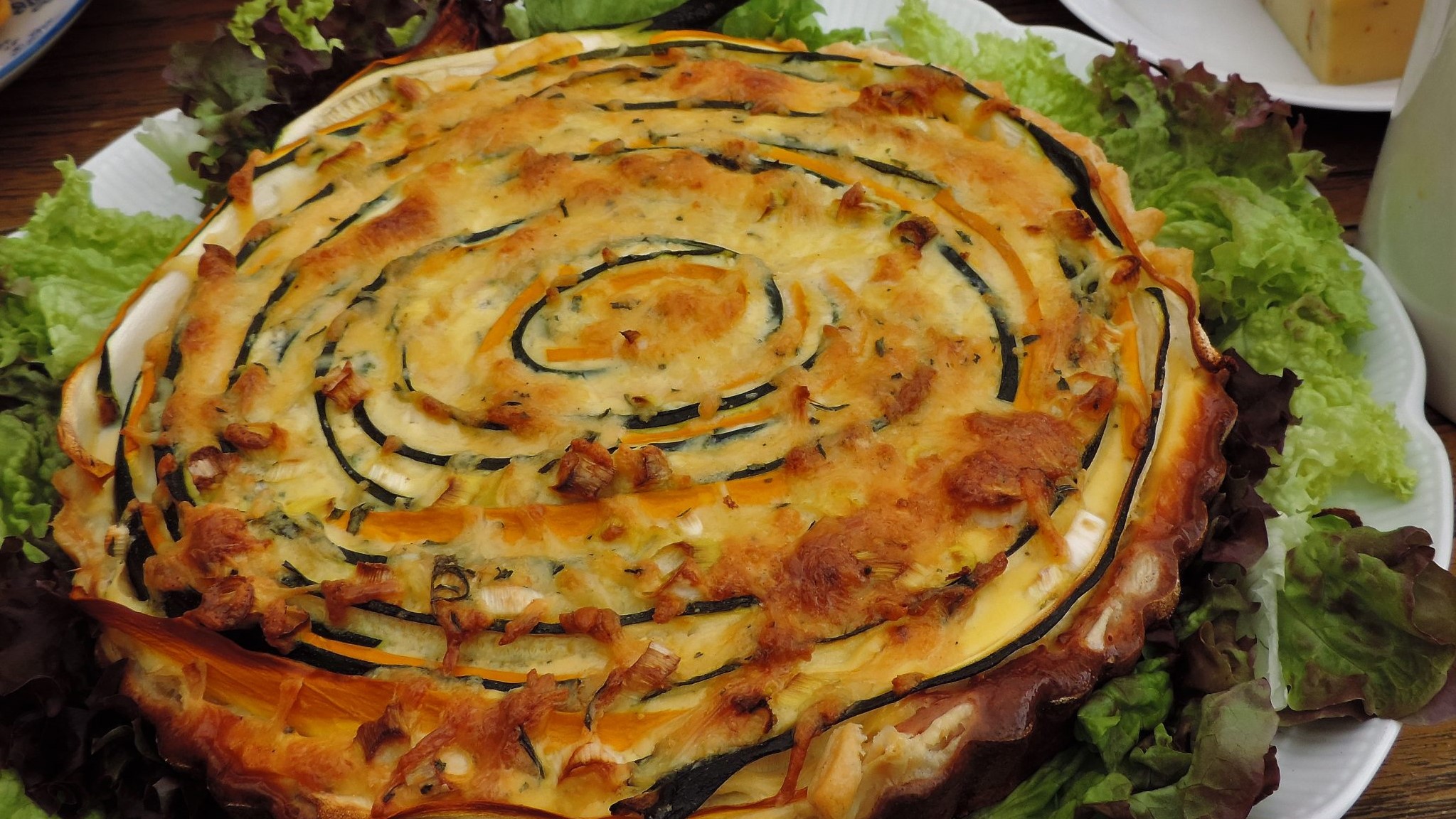 Taart met courgette 17 augustus 2023 Whatsapp Share Share Ingredieënten voor 4 personen. 3 courgettes 200 gram roomkaas 2 eieren plak bladerdeeg voor de bodem gedroogde dragon 100 gram geraspte kaas 1 lente-uitje. Bereiding: Smeer een quichevorm in met een beetje boter en bekleed de bodem met bakpapier. Bekleed de vorm met bladerdeeg en prik deze in. Leg er een groot stuk bakpapier op en doe er steunvulling in. Bak de bodem 25-30 minuten voor in een oven van 175 graden. Verwijder het bakpapier met de steunvulling en laat een beetje afkoelen. Het waarom van blind bakken vind je hier. Schaaf of snij de courgette in dunne plakken, als de courgette wat dik is, snij er dan een reep vanaf, de repen moeten iets hoger dan de vorm zijn. Doe de repen in de vorm en werk van binnen naar buiten en laat steeds iets overlappen. Vul tot de vorm goed vol is en voeg eventueel hier en daar nog een stukje toe. Klop de roomkaas los met wat zout en peper. Voeg de eieren er een voor een bij en roer deze er doorheen. Doe er nu de in ringetjes gesneden lente-ui, de geraspte kaas en de dragon bij en roer door. Giet dit voorzichtig gelijkmatig over de courgette. Bak de taart in ongeveer een uur goudbruin en gaar. Serveer warm of lauwwarm. Eet smakelijk en tot volgende week. Nieuws