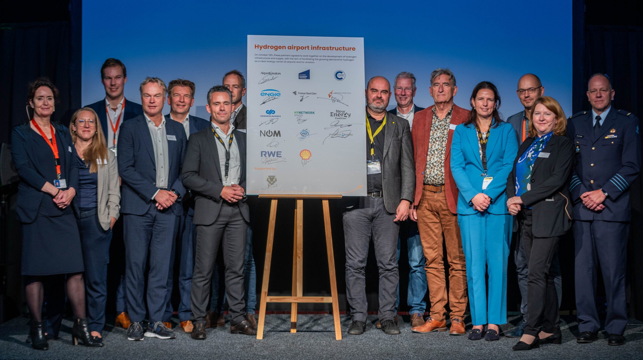 Intentieverklaring voor de ontwikkeling van waterstofinfrastructuur op Groningen Airport Eelde ondertekend 13 oktober 2023 Whatsapp Share Share EELDE – Vrijdag is op Groningen Airport Eelde (GAE) een intentieverklaring ondertekend in aanwezigheid van gedeputeerde Jisse Otter van de Provincie Drenthe en 120 gasten uit de energie- en luchtvaartsector. Hiermee wordt de ontwikkeling en levering van een vloeibare en gasvormige waterstofinfrastructuur geïnitieerd. Dit is gedaan tijdens het side-event van het jaarlijkse Wind meets Gas symposium, welke plaatsvond in één van de hangars van de KLM Flight Academy op de luchthaven. Tijdens het event is er in een paneldiscussie met onder andere Airbus, RWE en PAL-V gesproken over de thema’s mobiliteit en energie. De luchthaven werkt samen met duurzame partners aan een groene waterstofinfrastructuur. Na de paneldiscussie is de intentieverklaring ondertekend door alle betrokken partners, te weten Fokker NextGen, Provincie Drenthe, RWE, Hy Network Services, Engie, het Nederlands Lucht- en Ruimtevaartcentrum (NLR), NOM, Shell, Airport Creators, New Energy Coalition, Groningen Seaports en Groningen Airport Eelde. De Air Combat Command van de Koninklijke Luchtmacht heeft aangegeven het initiatief te steunen. Deze partijen gaan samenwerken bij het ontwikkelen van een groene waterstofinfrastructuur op Groningen Airport Eelde. Zij zullen hun krachten en hun expertise bundelen om een zo efficiënt en duurzaam mogelijk waterstofnetwerk tot stand te brengen. Met als doel waterstof op te slaan, te transporteren en op termijn te leveren aan afnemers, zoals luchtvaartmaatschappijen. Naast het uitvoeren van een haalbaarheidsstudie, worden ook zaken als het verkrijgen van vergunningen en het aantrekken van financiële middelen opgepakt. Jisse Otter, Gedeputeerde van Provincie Drenthe is positief over de samenwerking: “Dit sluit perfect aan op het feit dat Groningen Airport Eelde de eerste Hydrogen Valley Airport van Europa is. Deze luchthaven is van groot belang voor de energietransitie in de regio en voor de verduurzaming van de luchtvaart.” Nieuws
