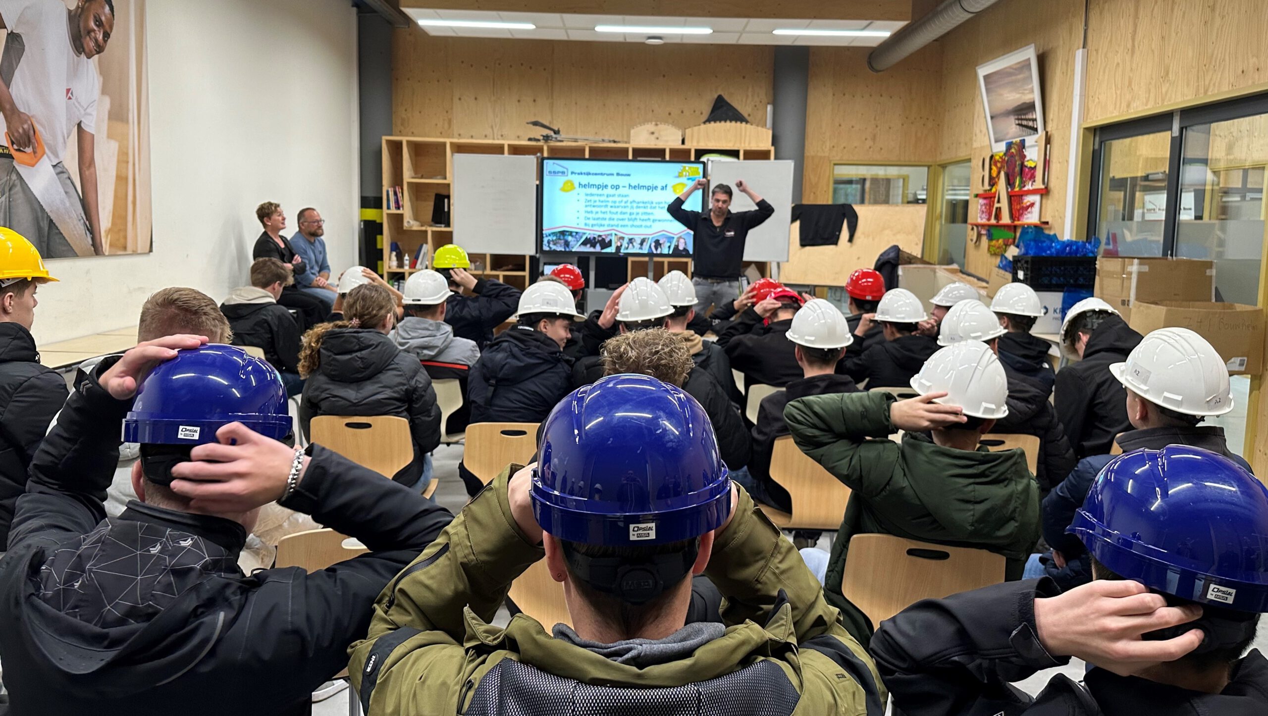 Leerlingen Terra Winsum en Hogeland College op sectorbezoek Bouwen en Wonen 9 november 2023 Whatsapp Share Share WINSUM – Leerlingen van Terra Winsum en het Hogeland College brachten op donderdag 2 november een bezoek aan twee bedrijven in de sector BW(I): Bouwen en Wonen. In totaal namen 38 leerlingen deel aan deze Roadshow, afkomstig van Terra Winsum en het Hogeland College in Winsum en Uithuizen. Dit initiatief werd mede mogelijk gemaakt door de inzet van Vakland het Hogeland, Kansrijke Groningers en drie decanen van de vmbo-scholen in Winsum en Uithuizen. Via verschillende Roadshows krijgen de leerlingen de kans om verschillende sectoren te verkennen en kennis te maken met de bijbehorende bedrijven, beroepen en opleidingen. Het eerste bedrijf dat bezocht werd, was Eemshout Prefab. Eemshout Prefab is een enthousiast houtskeletbouwbedrijf. “De leerlingen kregen uitleg over de beroepen en werkzaamheden in de fabriek. Een interessant detail is dat een van de huidige werknemers van Eemshout Prefab een voormalige deelnemer is van de bekende Roadshows van Terra en HHC. Twee jaar geleden heeft hij tijdens een sectorbezoek een kijkje in deze sector genomen en raakte enthousiast. Het is geweldig om te zien dat hij een baan heeft gevonden in een sector waar hij gelukkig van wordt. Daar doen we het voor als school,” aldus Jelte Wolters, decaan van Terra Winsum. Vervolgens bezochten de leerlingen het Alfa-college aan de Protonstraat. Daar kregen ze een presentatie en konden ze de praktijklokalen bezoeken om kennis te maken met de vakken rondom de thema’s Bouwen en Wonen. Koert Vermeulen vanuit het opleidingsbedrijf SSPB Praktijkcentrum Bouw was ook aanwezig en kon de leerlingen vertellen hoe het opleidingsbedrijf kijkt naar de arbeidsmarkt en welke mogelijkheden zij in combinatie met de mbo-scholen in het bbl-traject aanbieden. Koert Vermeulen heeft daarbij de leerlingen een aantal vragen gesteld via het principe ‘helmpje op, helmpje af’. Als laatste brachten ze een bezoek aan aannemingsbedrijf Sietsema. Daar kregen de leerlingen uitleg over onder andere de geautomatiseerde zaagmachine. Als opdracht metselden de leerlingen met hun eigen samengestelde specie een muurtje. “Het was een mooie en leerzame dag, waarbij iedereen zijn of haar eigen ervaring kon opdoen.” Foto: Leerlingen spelen het spel ‘helmpje op, helmpje af’ Nieuws