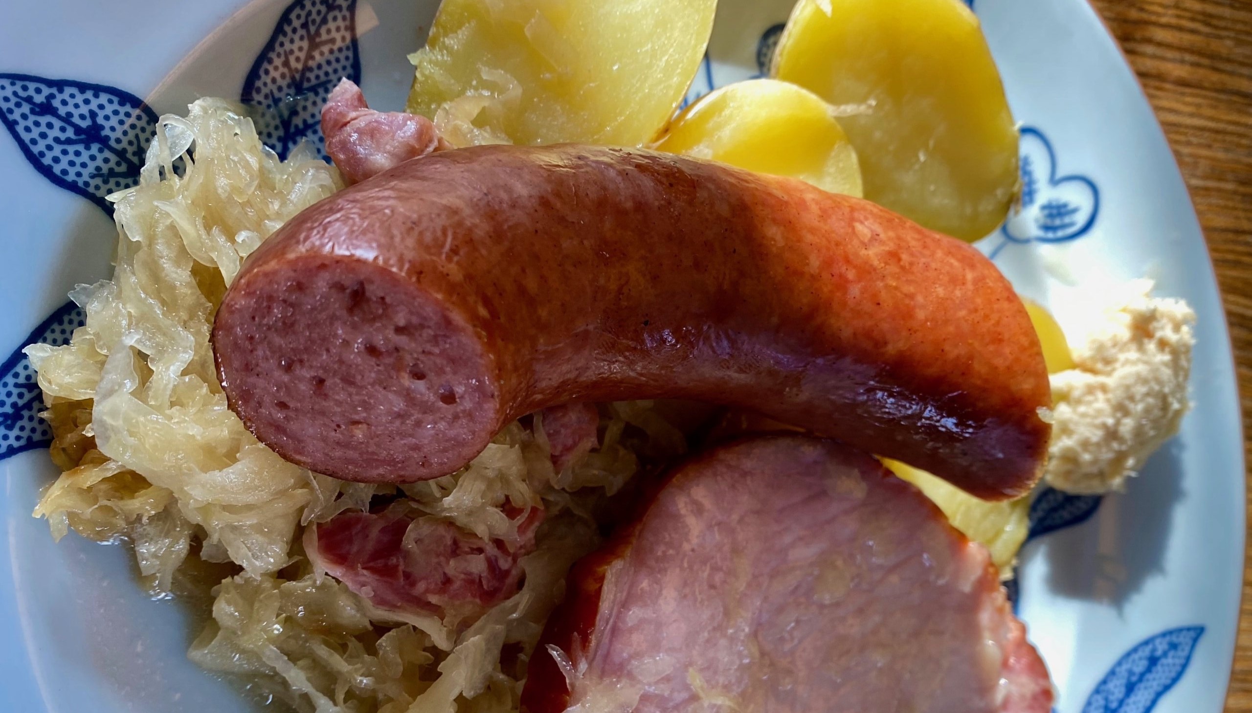 Zuurkool in ganzevet met gestoomde aardappel 8 december 2023 Whatsapp Share Share Ingredieënten voor 4 personen: 1200 g zuurkool Kramer 100 g ganzenvet 12 jeneverbessen 400 g zuurkoolspek in 6 plakken 200 ml droge witte wijn 300 ml kippenbouillon 600 g casselerrib in 6 plakken 2 rookworsten verse Dijon mosterd Bereiding: Spoel de zuurkool goed onder de koude kraan, laat uitlekken en druk de laatste druppels water er met de hand uit. Smelt ganzenvet en stoof hier de zuurkool met jeneverbessen zacht in aan. Leg na 10 minuten plakken zuurkoolspek tussen de zuurkool en vul het geheel op met witte wijn en kippenbouillon. Laat zacht stoven met de deksel voor 2/3 op de pan. Roer de zuurkool af en toe om, maar pas op het spek, en leg na een uur de plakken casselerrib dakpansgewijs op de zuurkool. Laat met de deksel op de pan nog 20 minuten garen. Zet ondertussen de rookworst op in koud water, haal als het water tegen de kook aanzit van het vuur en laat nog 20 minuten welllen. Serveer met in de schil gestoomde aardappelen en van die lekkere Franse mosterd uit Dijon. Eet smakelijk en tot volgende week. Nieuws