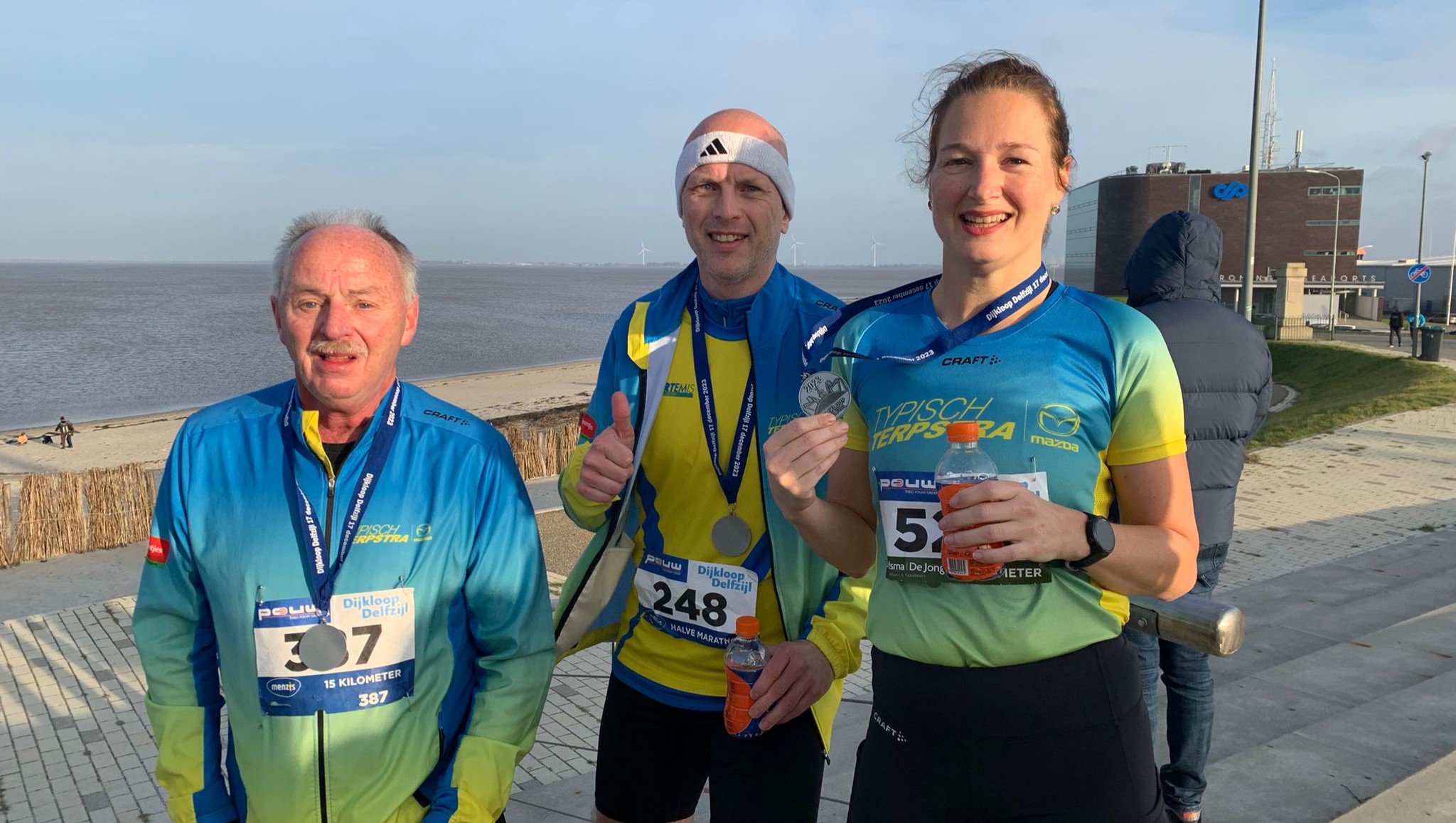 Artemissers lopen in Groningen, op Ameland en in Delfzijl 18 december 202318 december 2023 Whatsapp Share Share WINSUM – Leden van Loopgroep Artemis uit Winsum deden het afgelopen weekend mee aan wedstrijden in Groningen, op Ameland en in Delfzijl De tweede Stadspark Nightrun werd afgelopen vrijdagavond georganiseerd door Golazo Noord-Nederland. Het Groninger Stadspark vormde het decor met spectaculaire lichtanimaties, aansprekende muziek en verrassende acts. Bij deze run was iedereen welkom. Het wedstrijdelement ontbrak. Er werd ook geen tijd bijgehouden. De deelnemers, vertrokken in vier startwaves, konden kiezen uit de afstanden 6 en 10 kilometer. De lopers werd gevraagd hun meest spectaculaire outfit uit de kast te halen en samen het Stadspark te verlichten. Voor alle deelnemers was een headlight beschikbaar. De Artemissers Anne Hogerdijk, Rianne Bosch, Monique Medema, Jet van Dijk, Anko de Boer en Harry Hammenga hebben met veel plezier aan dit evenement deelgenomen. Op Ameland vond afgelopen zaterdag de 19e editie van de Adventurerun plaats. Voor de diverse afstanden van deze avontuurlijke run hadden zich totaal 4350 sporters ingeschreven. Het selectieve parcours was grotendeels onverhard en geaccidenteerd. Het was uitgezet in de afwisselende en prachtige natuur van Ameland. Kwelders, duinen, bos en het onvoorspelbare strand vormden het decor van deze avontuurlijke run. De start en finish waren weer op de Reeweg in het gezellige en sfeervolle centrum van Nes. Het was droog maar de deelnemers ondervonden veel hinder van de wind. Een niet geheel fitte Janneke Cazemier uit Warffum was de enige afgevaardigde op de halve marathon van Artemis. Zij weerde zich kranig. Na een doorkomst halverwege in 1.06.04 uur finishte zij na 2.20.05 uur als 16e bij de vrouwen 60 in een veld van 22 deelneemsters. Fanny Kaper 3e op de 5 kilometer in de Dijkloop Delfzijl Voor de zondag gehouden Dijkloop in Delfzijl hadden zich voor de zes verschillende afstanden totaal 340 lopers aangemeld. De routes voerden de lopers langs de vernieuwde dijk van Delfzijl richting de Eemshaven en weer terug. Hierop waren keerpunten aangegeven op de helft van de gekozen afstand. De 27 marathonlopers hadden hun keerpunt in de Eemshaven zelf. Om het passeren van de lopers zo gemakkelijk mogelijk te maken moest zoveel mogelijk rechts worden gelopen. Er stond een stevige wind waarvan de lopers na het keerpunt de nodige hinder ondervonden. Artemis was met vier leden vertegenwoordigd. Op de 5 kilometer bij de vrouwen behaalde Fanny Kaper uit Winsum met een tijd van 25.16 minuten een knappe derde plaats in een veld van 45 deelneemsters. Geert Jan Reinders uit Loppersum was een van de deelnemers aan de 15 kilometer. Hij klokte als 21e bij de mannen een tijd van 1.35.41 uur. De stad-Groninger Marnix van den Brink startte op de halve marathon. Hij deed dit als training en kwam na 1.57,28 uur als 41e bij de mannen over de streep. Arjen Kwint uit Loppersum besloot zich op het laatste moment nog in te schrijven voor de marathon. Hij noteerde in zijn 21e marathon onder de vlag van Artemis als 27e en laatste een tijd van 4.56.18 uur. De Lopster ontving hiervoor een prachtige boeket bloemen. Foto: v.l.n.r. Geert Jan Reinders, Marnix van den Brink en Fanny Kaper. Nieuws