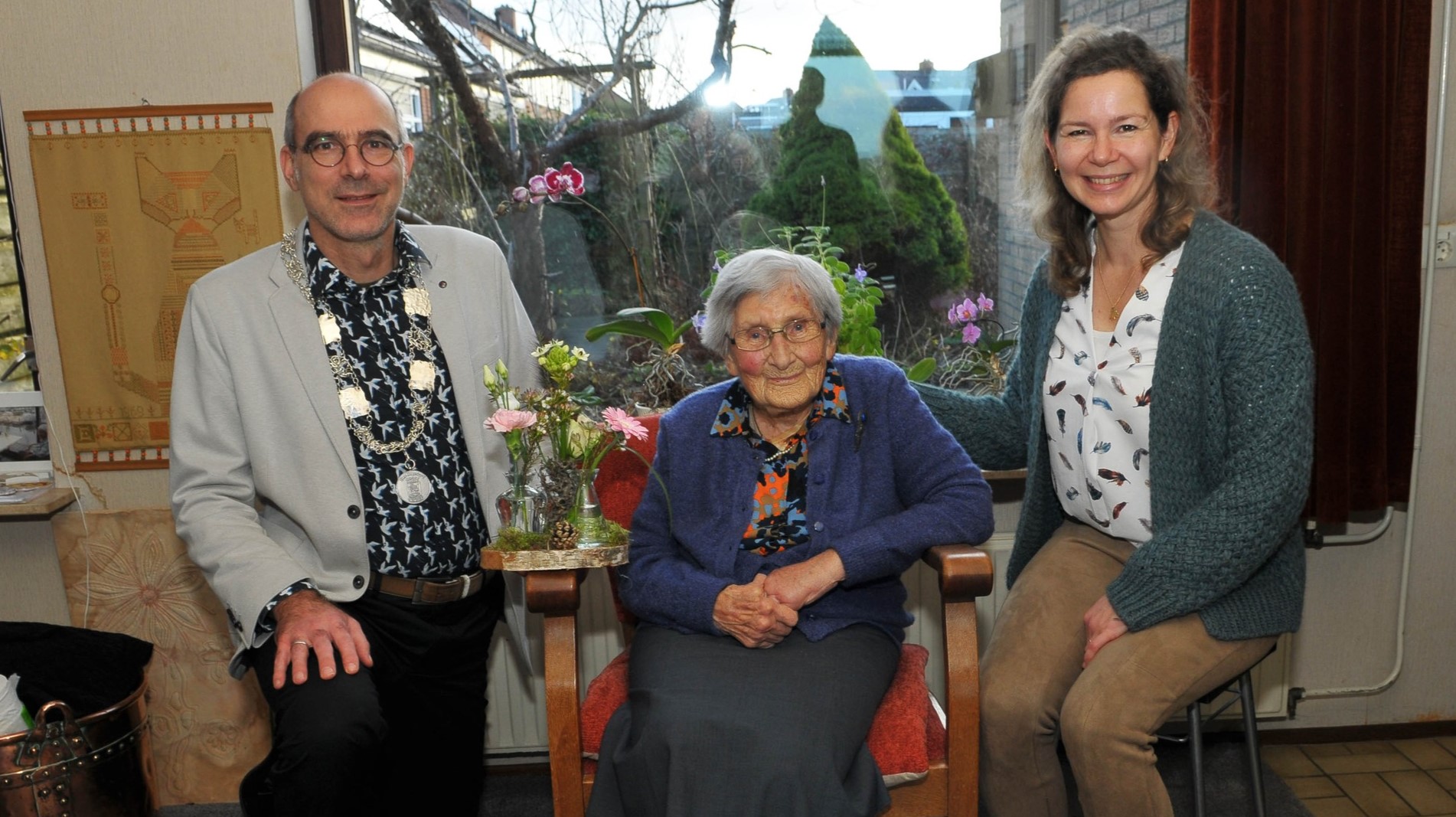 Mevrouw Enny Sikkema-Hommes blaast 106 kaarsjes uit 29 december 202329 december 2023 Whatsapp Share Share UITHUIZERMEEDEN – Mevrouw Enny Sikkema-Hommes uit Uithuizermeeden vierde vrijdag haar 106e verjaardag. Namens de gemeente kwam wethouder Arjen Nolles ’s ochtends op bezoek om haar te feliciteren met deze mijlpaal. Enny Hommes zag op 29 december 1917 het levenslicht in ‘t Waar. Ze groeide op in Korengarst, bij Noordbroek. Na haar huwelijk verhuisde ze naar Oudeschip. Ze was altijd huisvrouw. Ze kreeg drie kinderen: een zoon en twee dochters. Ook heeft ze 6 kleinkinderen en 8 achterkleinkinderen. Haar oudste dochter is in september op 80-jarige leeftijd overleden. Sinds 1983 woont mevrouw Sikkema-Hommes in Uithuizermeeden. Ze houdt van puzzelen, tuinieren en handwerken en sport nog regelmatig. Foto: Mevrouw Enny Sikkema-Hommes, geflankeerd door wethouder Arjen Nolles en een van haar kleindochters. Nieuws