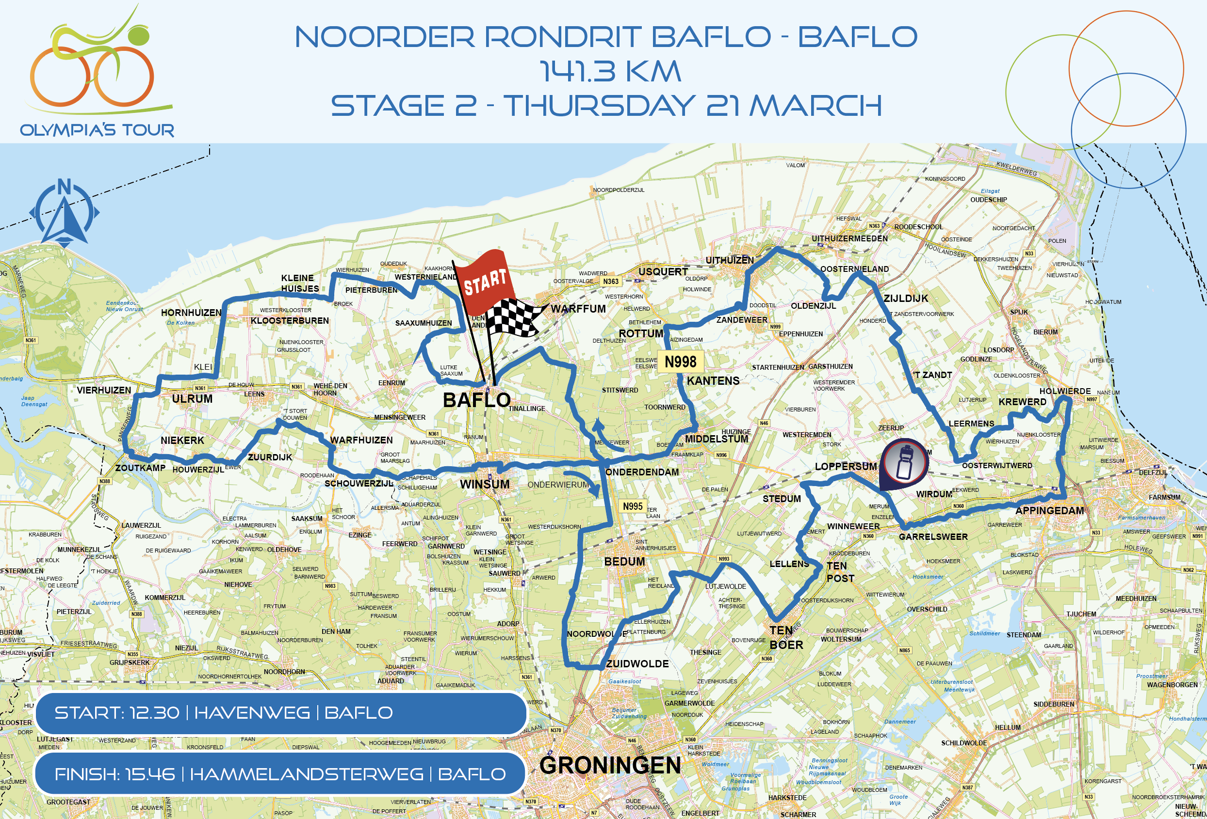 BAFLO – Met de rit Baflo-Baflo is het etappeschema van Olympia’s Tour compleet. Deze in schaats- en wielerkringen bekende Noorderrondrit zal als tweede etappe van de oudste etappekoers van Nederland dienen en op donderdag 21 maart worden verreden. De 141 kilometer lange rit start om 12.30 uur aan de Havenweg in Baflo en finisht omstreeks 15.45 uur aan de Hammelandsterweg in diezelfde plaats.