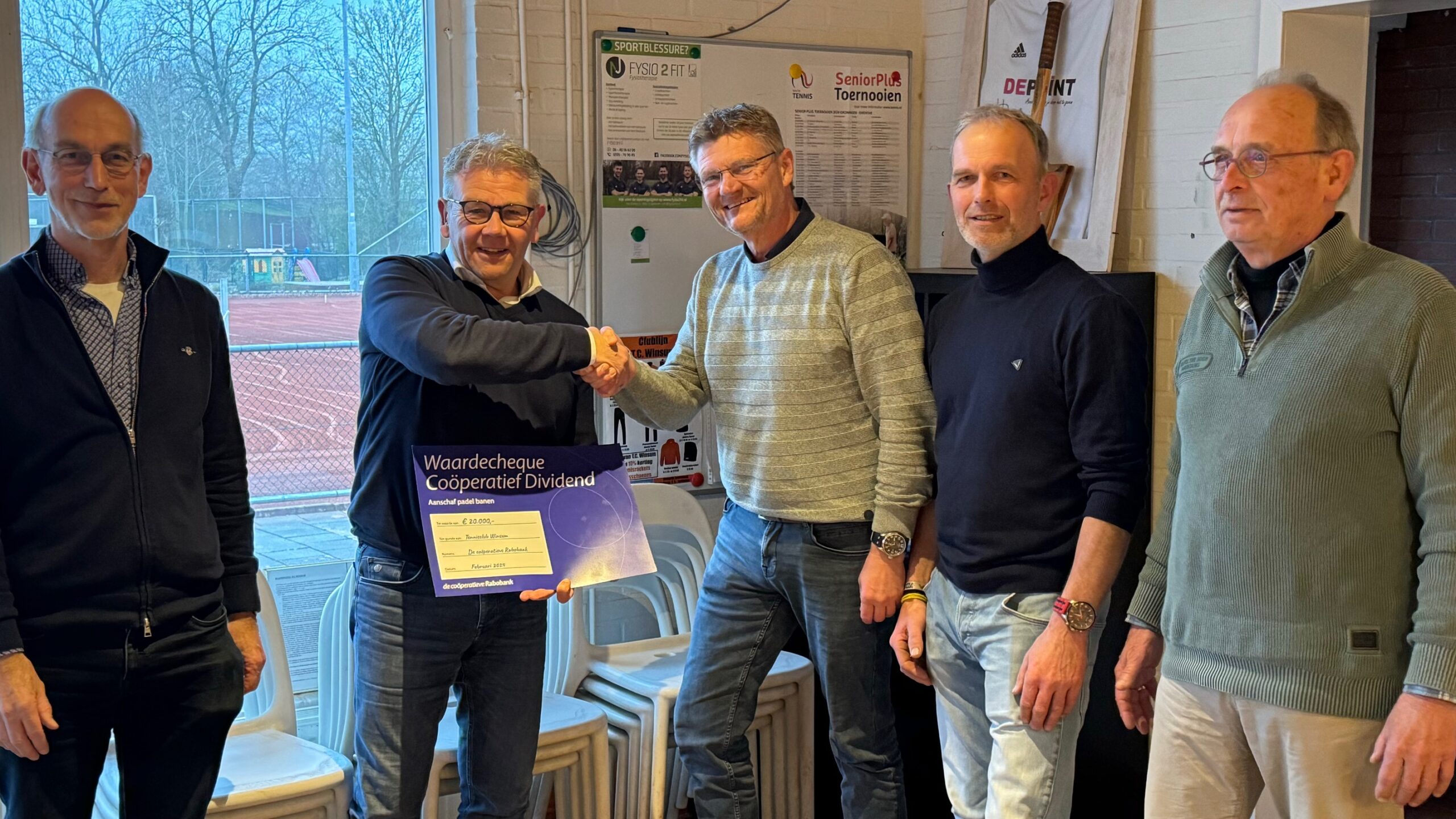 Tennisclub Winsum ontvangt cheque Rabobank 7 maart 2024 Whatsapp Share Share Tennisclub Winsum heeft maandag 4 maart een cheque van 20.000 euro ontvangen van de Rabobank. De Rabobank bestaat 125 jaar en om dit te vieren worden projecten die de lokale leefbaarheid versterken financieel ondersteund. TC Winsum heeft het geld gekregen om het plan om padelbanen aan te leggen een extra steuntje in de rug te geven. De financiering van het plan is hiermee rond maar de vereniging is nog wel in afwachting van definitieve vergunningen. Op de foto wordt de cheque door een vertegenwoordiging van de Rabobank overhandigd aan het bestuur van TC Winsum. Van links naar rechts op de foto: Geert Siegers (penningmeester), Evert Wieringa (Rabobank), Koos Veen (bestuur TC Winsum), Bert Leegte (Rabobank) en Tiemen Oosting (voorzitter). Nieuws