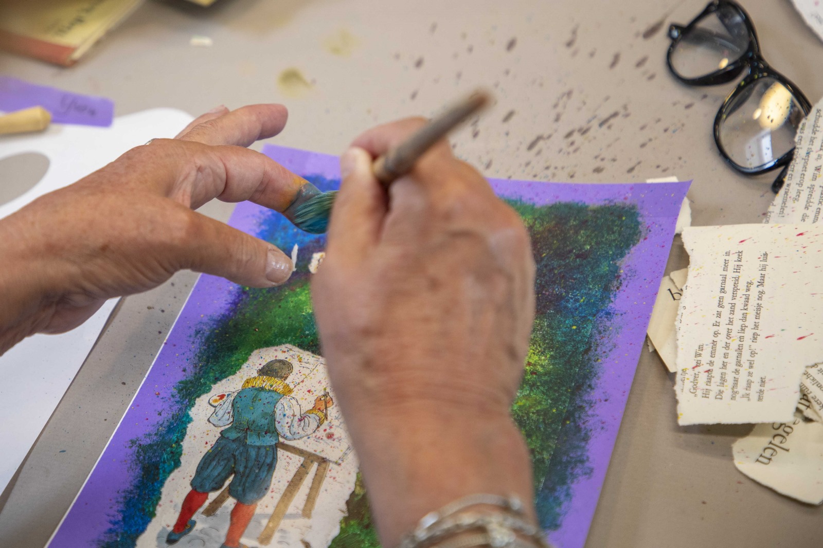 Onder begeleiding van kunstenares Renate Martini, experimenteren de deelnemers met een drietal basiskleuren. Door het combineren van verschillende verftechnieken en de toevoeging van illustraties uit de oude kinderboeken, worden er prachtige kunstwerken gemaakt. De sfeer is gezellig en ongedwongen, koffie, thee en een koekje staan klaar.