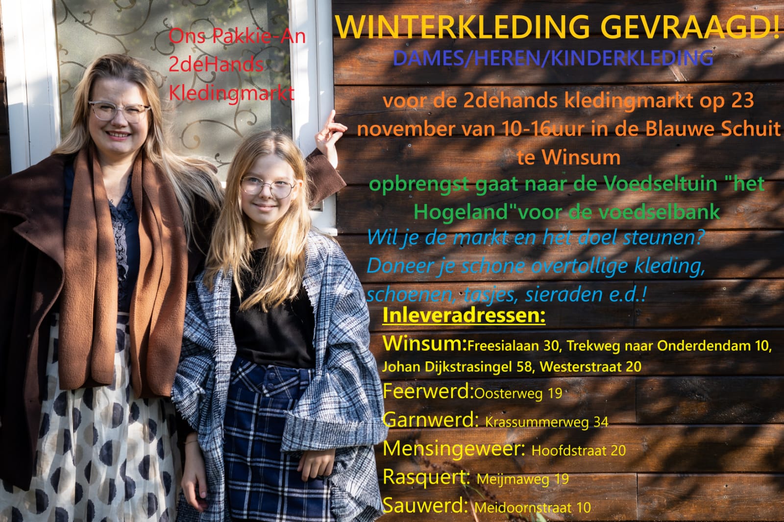 2dehands Winterkleding voor de Voedseltuin 13 november 202413 november 2024 Whatsapp Share Share De dames van Pakkie Ann organiseren opnieuw een marktdag met 2de-hands kleding in de Blauwe Schuit te Winsum. Ook dit keer gaat de opbrengst naar een goed doel, namelijk naar de Voedseltuin Het Hogeland. Een deel van de teelt van de Voedseltuin gaat volgend jaar vervolgens naar de voedselbank. Met het winterseizoen voor de deur richt deze markt zich op winterkleding. Overbodig geworden, schone kleding kan worden ingeleverd op onderstaande adressen. Ook schoenen, tasjes, sieraden en kleding-accessoires zijn van harte welkom. Inleveradressen: Winsum: Freesialaan 30, Trekweg naar Onderdendam 10, Johan Dijkstrasingel 58 of Westerstraat 20. Feerwerd: Oosterweg 19 Garnwerd: Krassumerweg 34 Mensingeweer: Hoofdstraat 20 Rasquert: Meijmaweg 19 Sauwerd: Meidoornstraat 10 De markt wordt gehouden op 23 november In de Blauwe Schuit, Warfstraat 1 te Winsum vanaf 10u00 . Agenda Het Hogeland
