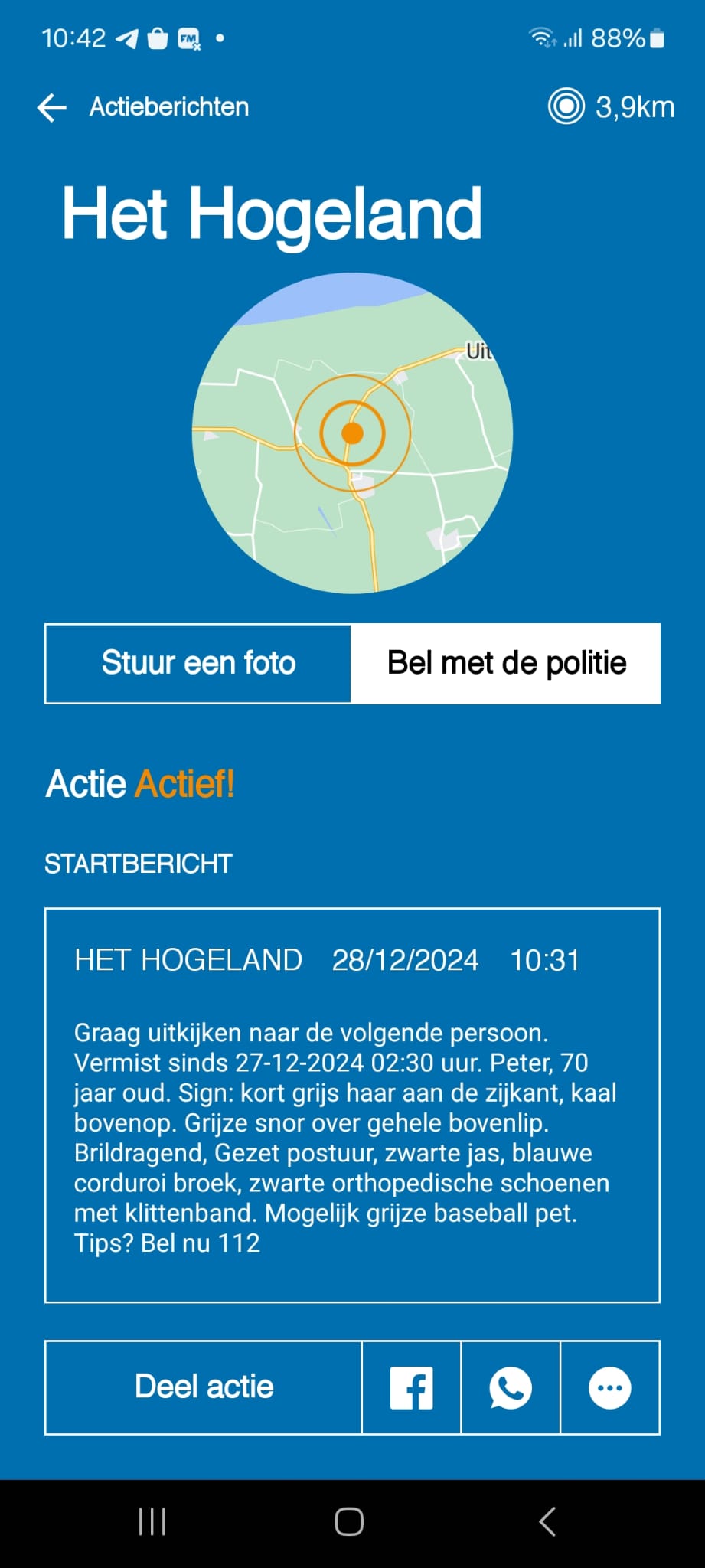Burgernet: Man vermist in Het Hogeland (update) 28 december 202428 december 2024 Whatsapp Share Share Update: de man is aangetroffen Burgernet heeft vanmorgen een melding gedaan over een vermiste man in Het Hogeland. Dit is het bericht: Graag uitkijken naar de volgende persoon. Vermist sinds 27-12-2024 02:30 uur. Peter, 70 jaar oud. Sign: kort grijs haar aan de zijkant, kaal bovenop. Grijze snor over gehele bovenlip. Brildragend, Gezet postuur, zwarte jas, blauwe corduroi broek, zwarte orthopedische schoenen met klittenband. Mogelijk grijze baseball pet. Tips? Bel nu 112 Nieuws