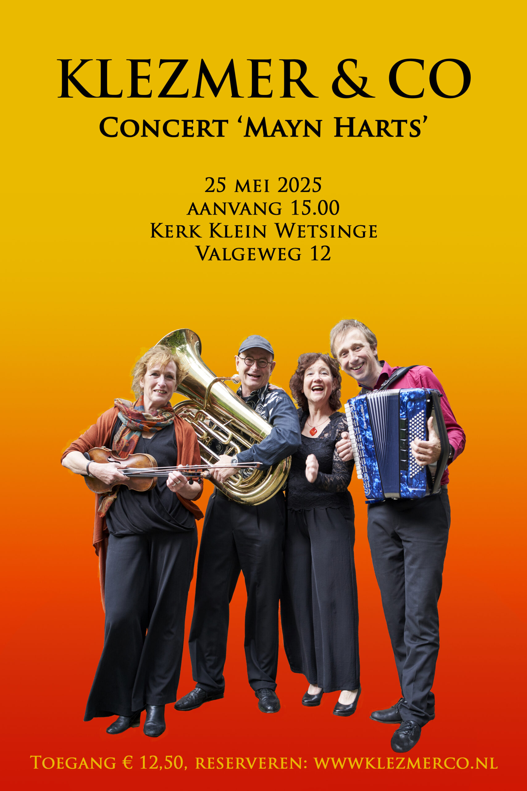 Klezmer & Co.– Concert ‘Mayn Harts’ in Kerk Klein Wetsinge 16 mei 202514 mei 2025 Whatsapp Share Share Op zondag 25 mei 2025 om 15.00 uur verwelkomen wij met veel plezier Klezmer & Co. in ons sfeervolle kerkje in Klein-Wetsinge, net boven de stad Groningen. Een middag vol muziek die zich perfect laat combineren met een mooie wandeling door het omliggende landschap van Sauwerd, Garnwerd en Groot/Klein Wetsinge.Klezmer & Co. brengt Jiddische liederen en klezmermuziek met een verhaal. Het viertal treedt al jarenlang met veel succes op in het noorden van het land, met Groningen als thuisbasis. Klezmer en Co bestaat uit: Carla da Silva – zang, Marjolijn Mellema – viool en zang, Wim Lever – accordeon, Albert Bleeker – tuba Muziek die raakt, ontroert en swingt.Locatie: Kerk Klein Wetsinge – Valgeweg 12, Aanvang: 15.00 uur, Toegang: €12,50Reserveren: www.klezmerco.nl Agenda Het Hogeland