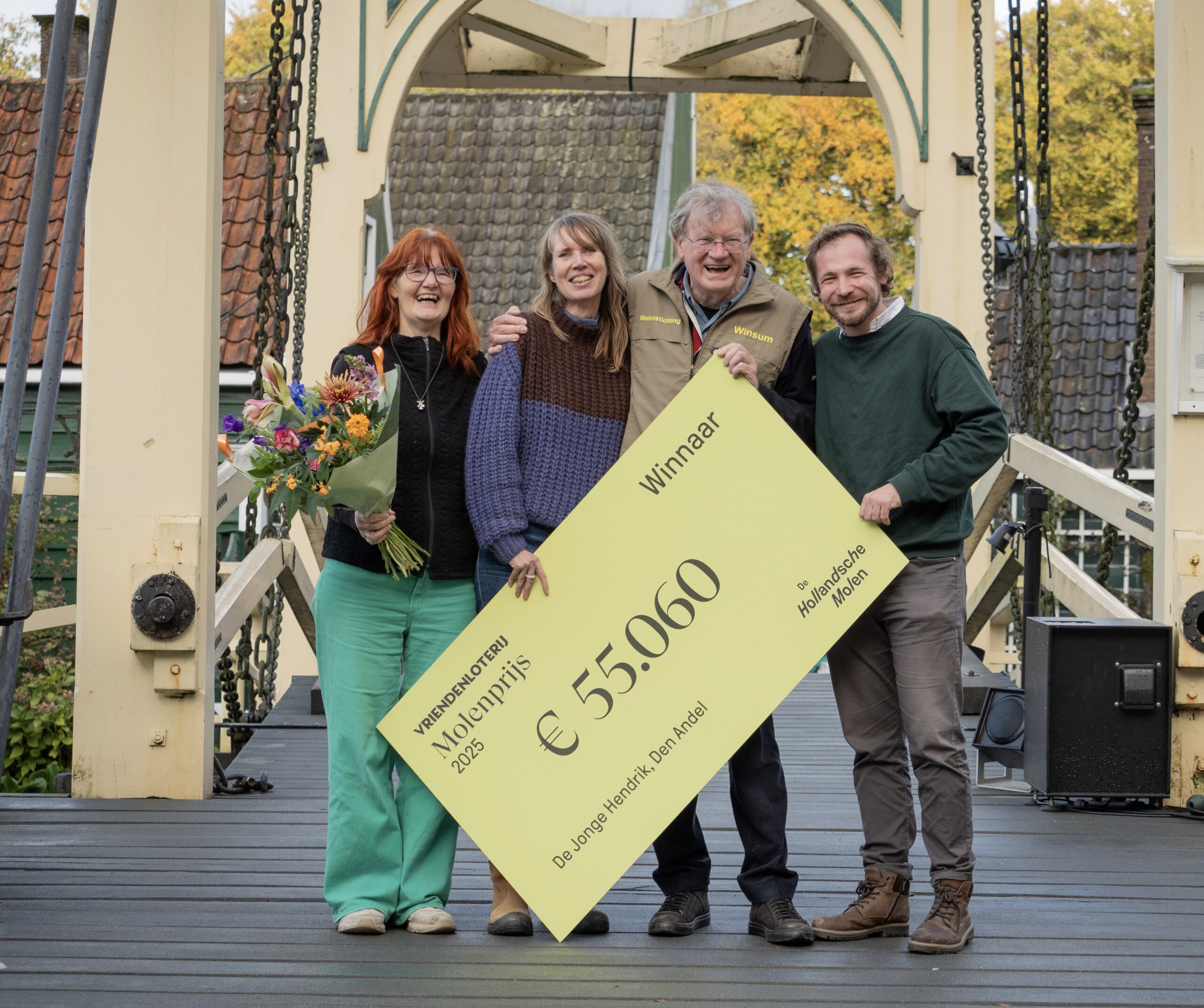 De Jonge Hendrik wint spannende VriendenLoterij Molenprijs 2025 27 oktober 2025 Whatsapp Share Share Molen De Jonge Hendrik in Den Andel (GR) heeft de VriendenLoterij Molenprijs 2025 gewonnen. Nicole Bakker, directeur-bestuurder van De Hollandsche Molen, maakte dit op 26 oktober bekend tijdens het Molenfestival in het Nederlands Openluchtmuseum in Arnhem. Het verschil met de concurrentie was in de 15-jarige geschiedenis van de Molenprijs zelden zo klein. De vrijwilligers van de winnaar verzamelden in de stemperiode van 10 september tot en met 5 oktober 5.060 stemmen en dat bleek nipt genoeg voor de winst. De zege levert De Jonge Hendrik € 50.000 op plus het aantal stemmen in euro’s. Dat betekent dat de Groningers met € 55.060 en een feestmuts op richting Den Andel reizen. Met dit geld kunnen onder meer sanitaire voorzieningen worden aangebracht die nu nog volledig ontbreken, zoals een aansluiting op riolering en waterleiding, toilet en wasgelegenheid. Hansmaarten Bolle, voorzitter en secretaris van Molenstichting Winsum, eigenaar van De Jonge Hendrik: ‘We zijn verrast en overdonderd. Zeker toen we zagen wat de andere genomineerden allemaal hadden gedaan. Ontzettend fijn dat we nu meer gasten kunnen verwelkomen en toegankelijk hart van het dorp kunnen zijn.’ Overige deelnemers De tweede plaats is met € 19.758 (€ 15.000 plus 4.758 stemmen/euro’s) voor molen De Hegeman in Dijkerhoek (OV). De Wilper Molen in Posterenk (GLD) haalde plek drie en incasseert € 11.792 (€ 7.500 plus 4.292 stemmen/euro’s). De vierde plaats leverde De Oosterlandse Molen in Oosterland (ZL) € 5.312 (€ 2.500 plus 2.812 stemmen/euro’s) op. Over de VriendenLoterij Molenprijs De VriendenLoterij Molenprijs is een jaarlijkse publieksprijs, ingesteld door De Hollandsche Molen in samenwerking met de VriendenLoterij. Met de prijs willen beide organisaties laten zien dat molens een onmisbaar onderdeel zijn van het Nederlands cultureel erfgoed. De prijs maakt het mogelijk een bijzonder project bij de molen te realiseren, gericht op het aantrekken van nieuwe publieksgroepen of het presenteren van de verschillende erfgoedwaarden. Ook mag het gaan over het ontwikkelen van nieuwe, maatschappelijke, functies op de molen of herstelwerk. De VriendenLoterij Molenprijs werd dit jaar voor de 15e keer uitgereikt. Over De Hollandsche Molen De Hollandsche Molen zet zich al meer dan een eeuw lang in voor het behoud van monumentale wind- en watermolens in ons land. Daardoor telt Nederland nog steeds zo’n 1.200 molens. Molens die schitteren in het landschap, het dorp of de stad en die je vaak ook kunt bezoeken. Duizenden vrijwilligers zorgen ervoor dat de molens ook daadwerkelijk kunnen draaien en malen. In 2023 ontving de vereniging het predicaat Koninklijk. (Foto: In the Picture – Jan Willem Houweling) Nieuws