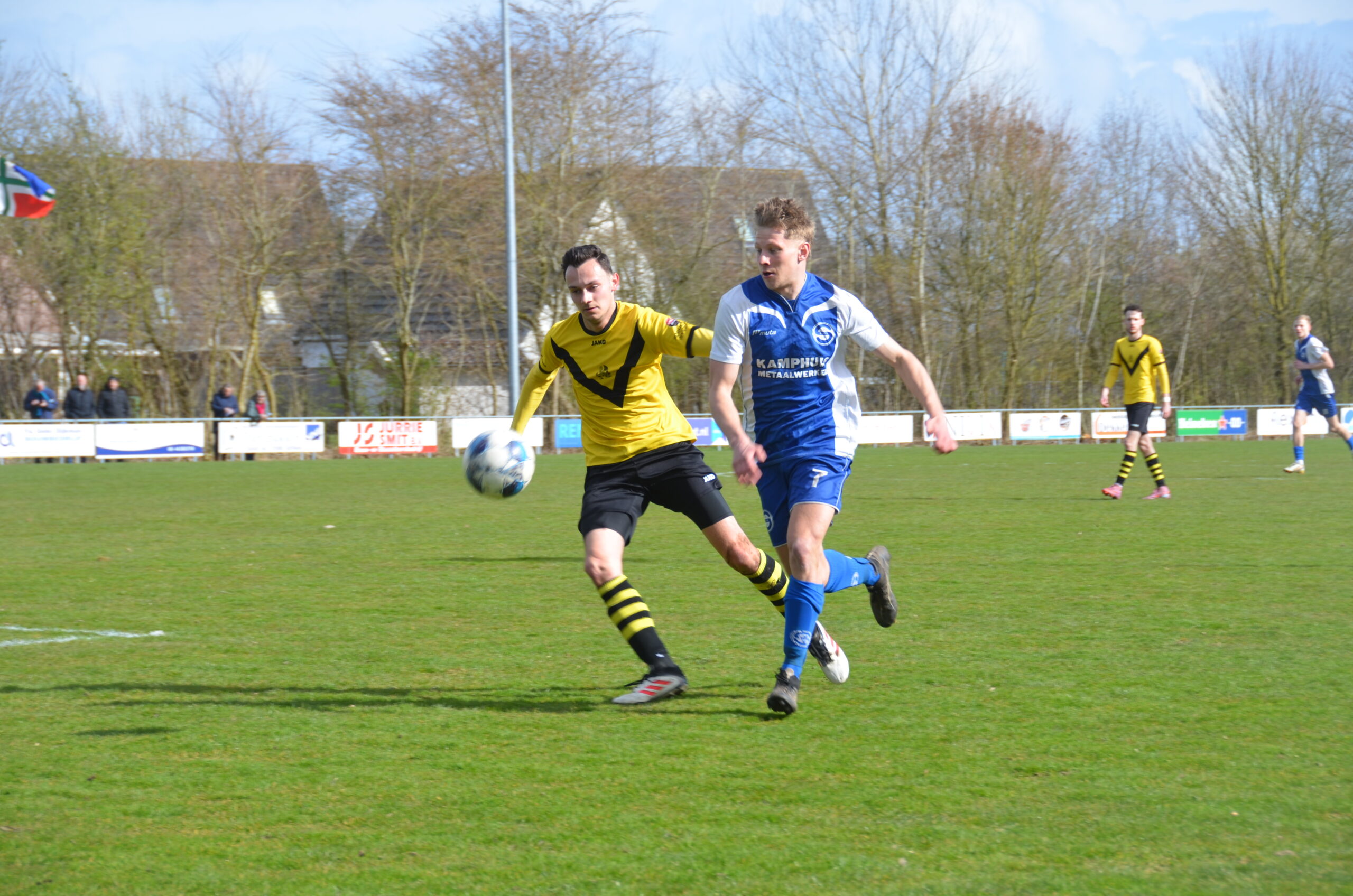 SIOS onderuit in voetbalgevecht tegen Poolster: ‘We hadden het geluk niet aan onze kant’ 29 maart 202629 maart 2026 Whatsapp Share Share ’’We balen van deze nederlaag’’, vertelde SIOS-trainer Quincy Dijkstra kort na de verloren uitwedstrijd tegen Poolster. Koploper SIOS was daarin niet de onderliggende partij, maar keerde wel met lege handen terug naar Sauwerd. Het verschil tussen SIOS en Poolster is ondertussen geslonken tot drie punten en daarmee neemt de spanning toe bovenin de vierde klasse E. Door Jeroen Kunst Beide ploegen begonnen nagenoeg compleet aan de confrontatie in Spijk en het waren de gasten die in de beginfase een licht overwicht hadden. Toch viel het doelpunt in de eerste helft aan de andere kant nadat Robbert Kok een corner op de juiste waarde wist te schatten en daarmee SIOS op achterstand zette. Poolster kwam na de voorsprong ook iets beter in de wedstrijd en wist de magere voorsprong in ieder geval te behouden tot aan de rust. Na de onderbreking moest SIOS komen en in deze fase van de wedstrijd hadden de gasten wederom een overwicht, maar tot doelpunten leidde het niet. Poolster kwam er via Tom Dijkman, Jelmar Christiaans en Nils Bansema wel een paar gevaarlijk uit, maar de kansen die Poolster creëerde bleven onbenut. Pas in de slotfase wist de thuisploeg de score te verdubbelen nadat Nils Bansema ploeggenoot Jelmar Christiaans wist te vinden en die maakte één op één met de keeper geen fout en gooide de wedstrijd in het slot. Poolster-trainer Bas Groeneveld kon zijn geluk niet op en zag dat zijn ploeg nu gedeeld aan kop gaat in de vierde klasse E. Overwicht ’’Dit is een hele mooie overwinning en ik ben trots op mijn ploeg, want we hebben nu drie keer van een team uit de top vier gewonnen en dat doen we erg goed.’’ Dijkstra vond dat het rendement van SIOS te laag lag. ’’Wij hadden een duidelijk overwicht voor rust en hadden twee keer moeten scoren. We hadden het geluk niet aan onze kant, want een schot van Bo Tukker ging ook maar rakelings voorlangs. Zij scoorden uit een corner en dit was eigenlijk hun enige kans. In de tweede helft zijn we teveel meegegaan in de lange ballen en het vechtvoetbal. We waren we te slordig in balbezit en we hebben geen goed slotoffensief neer kunnen zetten tegen een goed georganiseerd spelend Poolster.’’ In de vierde klasse E hebben SIOS en Poolster evenveel punten, maar SIOS heeft wel een duel minder gespeeld. Volgende week zaterdag gaat SIOS op bezoek bij Middelstum en Poolster is dan vrij. Het resterende wedstrijdprogramma ziet er als volgt uit voor beide ploegen. Zaterdag 4 april Middelstum – SIOS Zaterdag 11 april De Heracliden – Poolster SIOS – Lycurgus Zaterdag 18 april Poolster – FC Lewenborg HFC’15 – SIOS Zaterdag 9 mei Poolster – Middelstum SIOS – De Heracliden Zaterdag 16 mei Holwierde – Poolster De Fivel – SIOS Foto’s: Jeroen Kunst. Sport