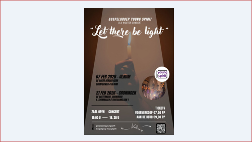 Gospelgroep Young Spirit Datum: 7 februari 2026Tijd: 19:30Locatie: UlrumKlik hier voor meer infoGospelgroep Young Spirit brengt begin februari het concertprogramma Let There Be Light naar Ulrum en Groningen. In het programma vertelt de groep het Bijbelse verhaal van Job op eigentijdse wijze, met een combinatie van muziek, zang en filmbeelden. Het concert volgt een man die de weg aflegt van verlies en duisternis naar hoop en herstel. De muziek bestaat uit een mix van gospel en moderne christelijke nummers, die samen een doorlopend verhaal vormen.